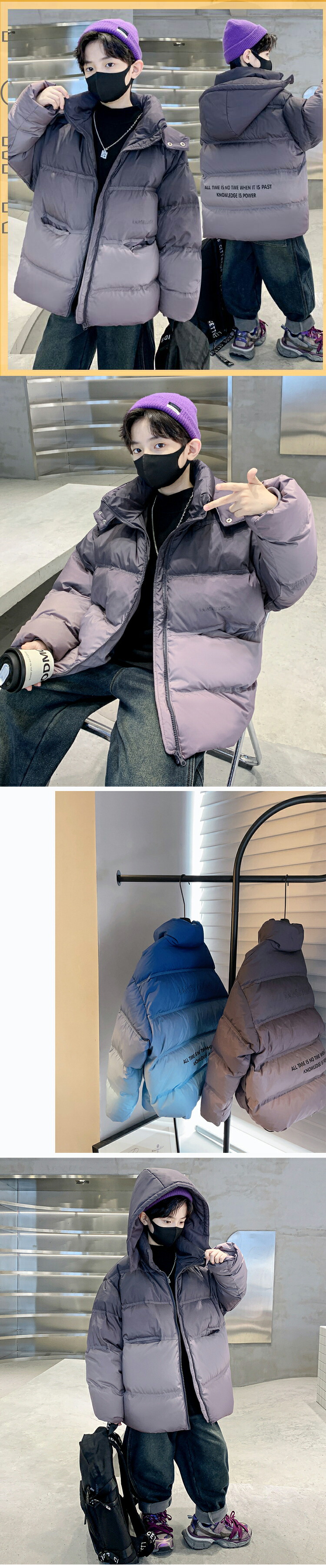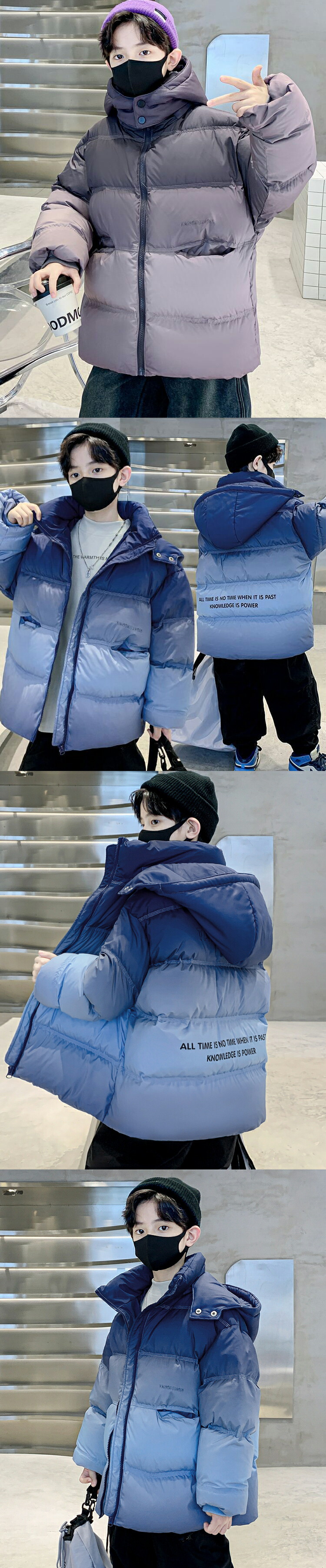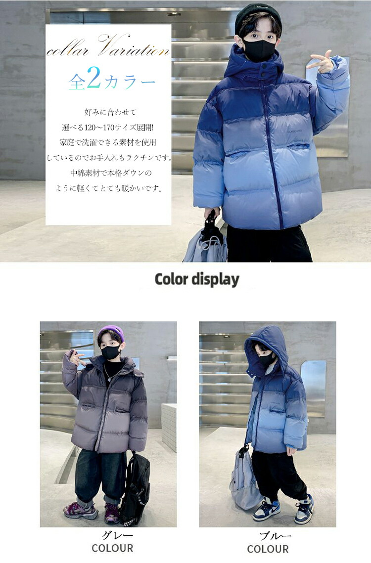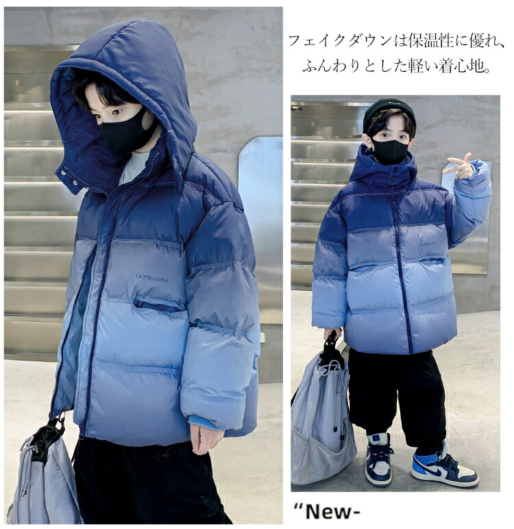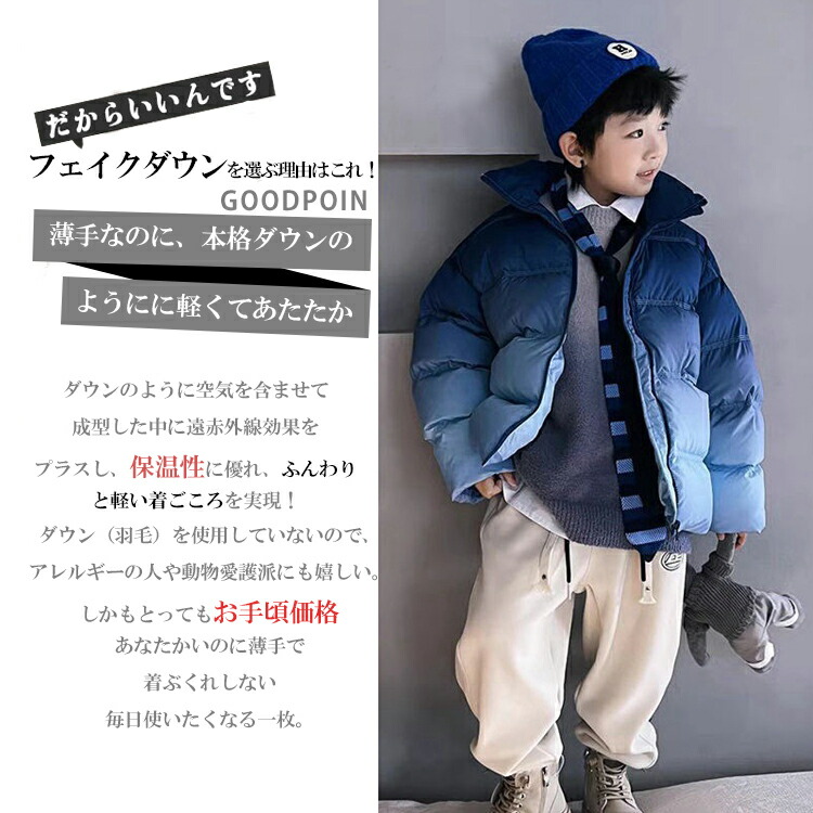キッズアウター 中綿コート フェイクダウン 秋冬 グラデーション キッズダウン アウター 寒さ対策 ハイネック 上着 ポケット付き プリントロゴ ファスナー 暖かい