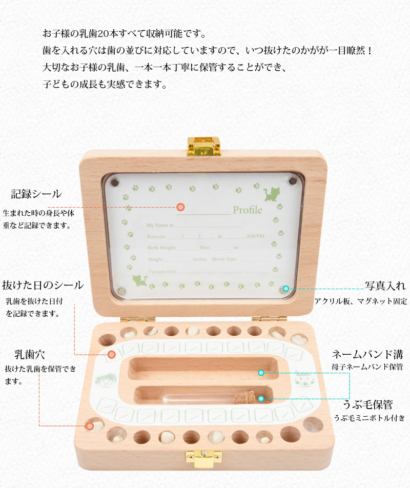 ★お子様の乳歯20本すべて収納可能です。歯を入れる穴は歯の並びに対応していますので、いつ抜けたのかがが一目瞭然!