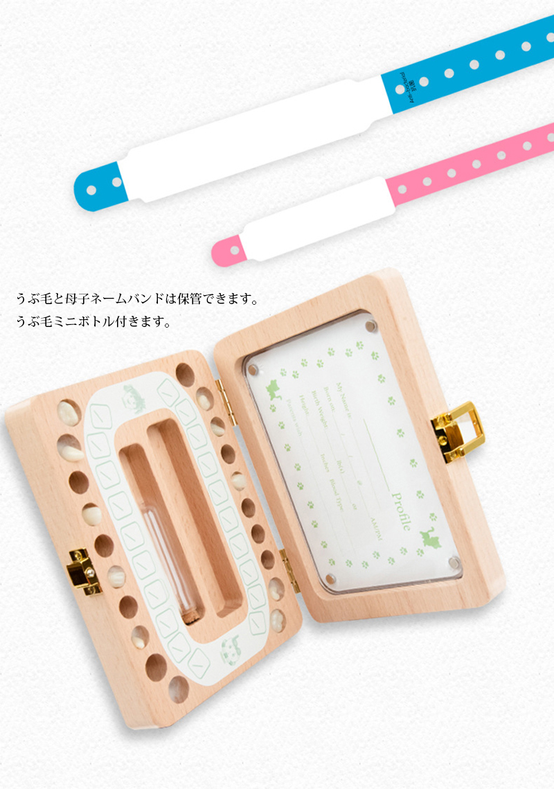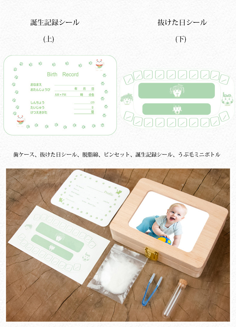 セット内容:1×歯ケース、1×抜けた日シール、1×脱脂綿、1×ピンセット、1×日本語誕生記録シール、1×うぶ毛ミニボトル