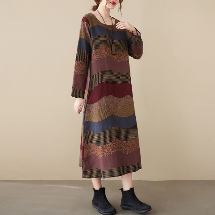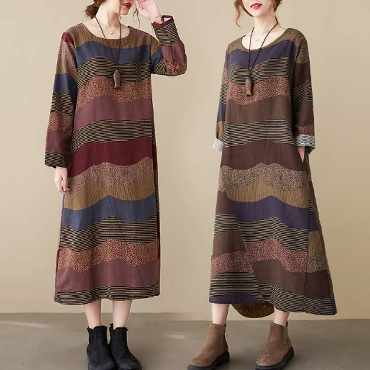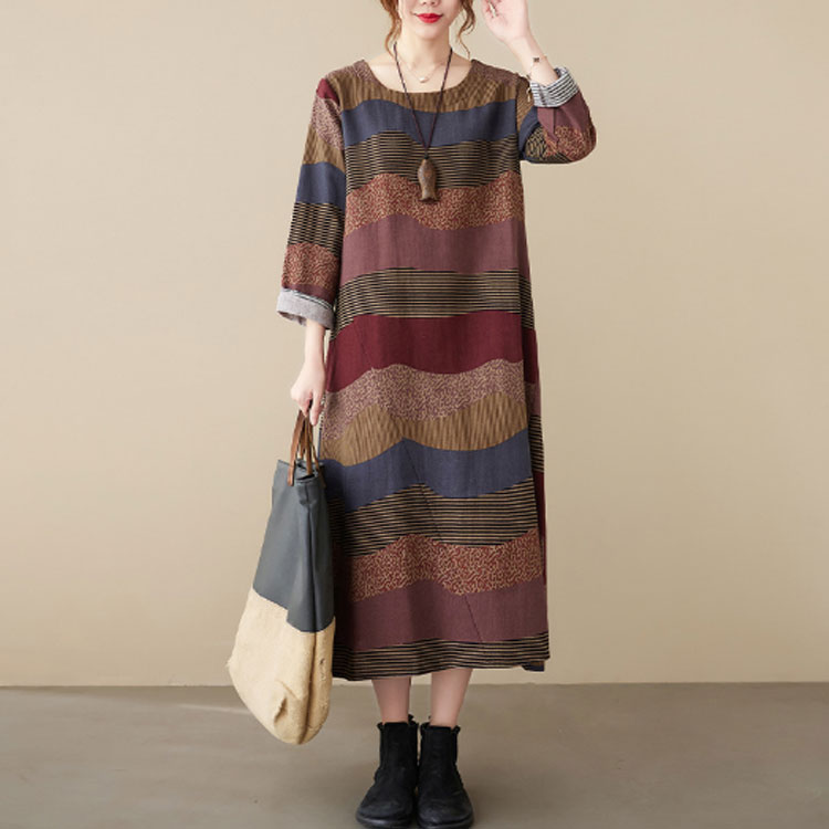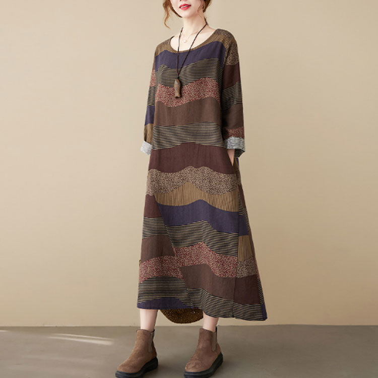 総柄 長袖ワンピース コットンリネン