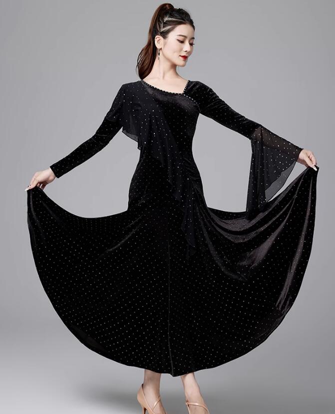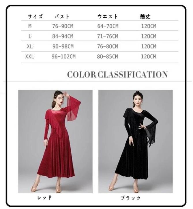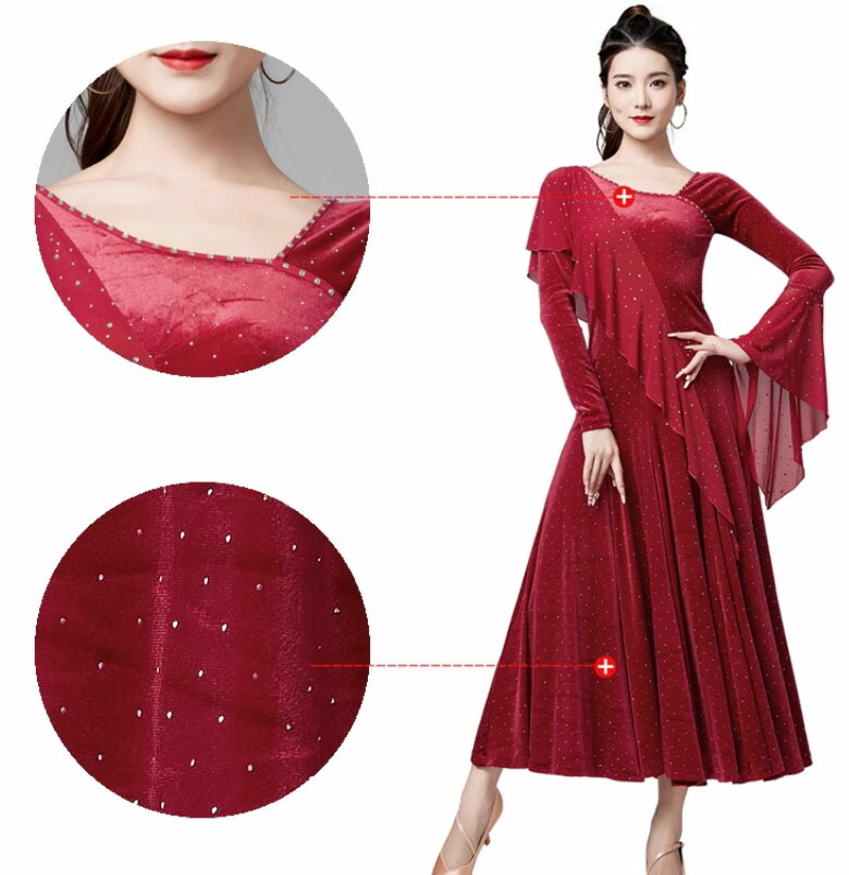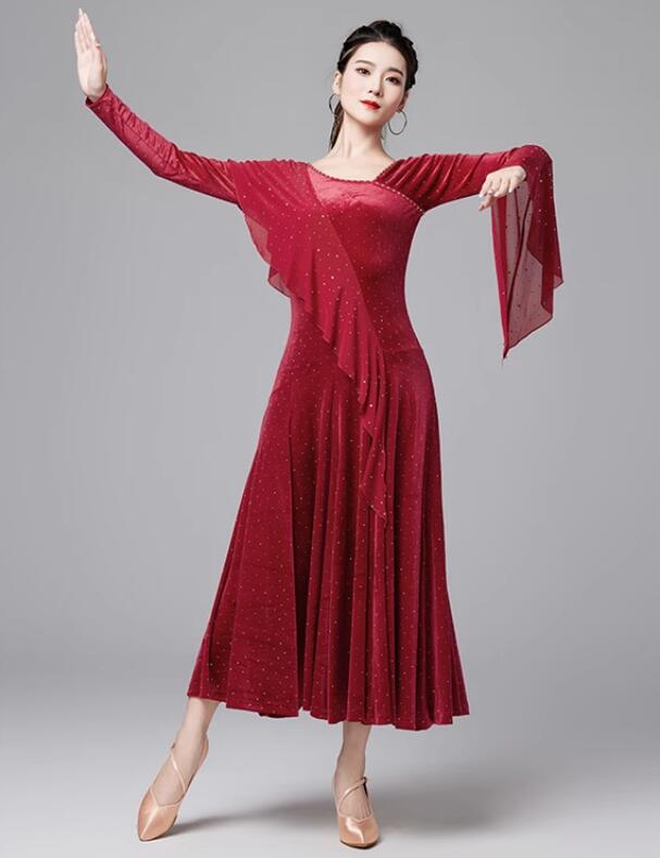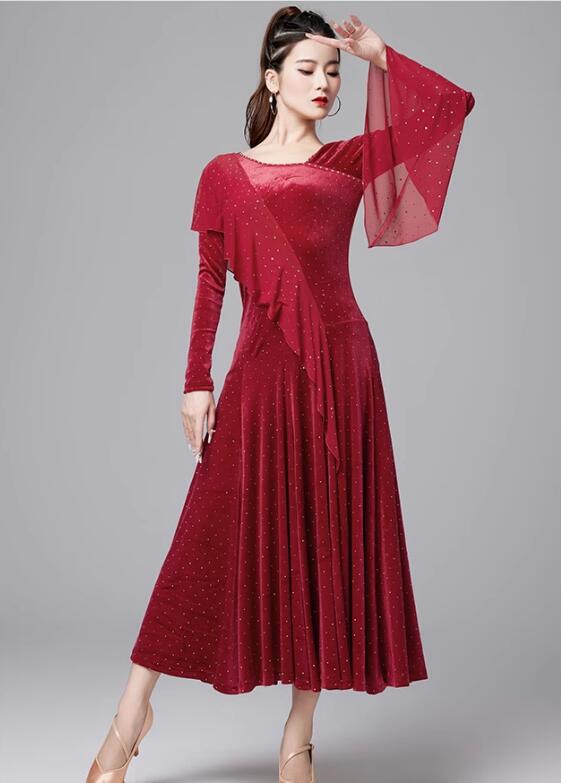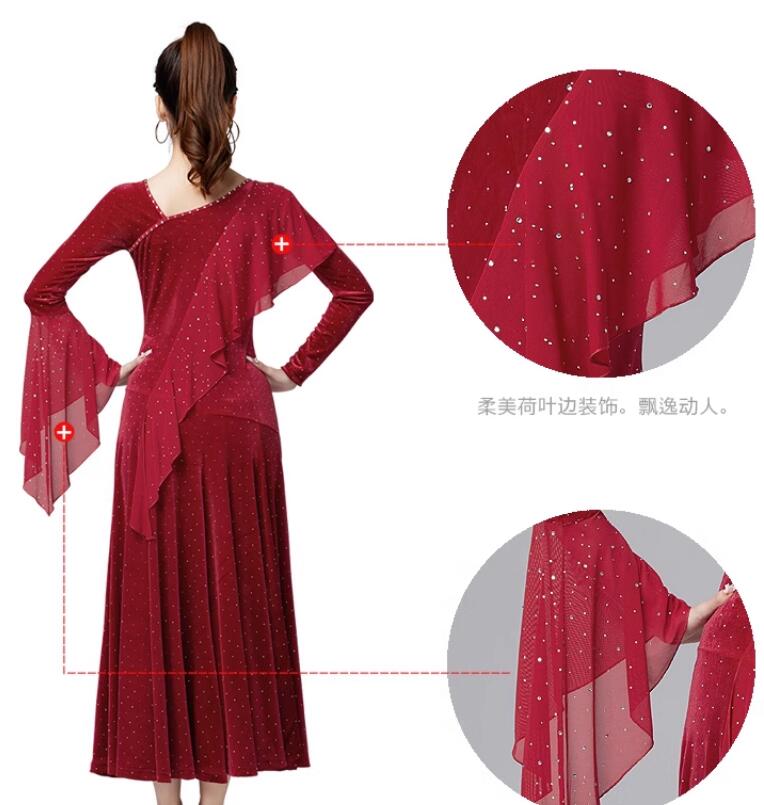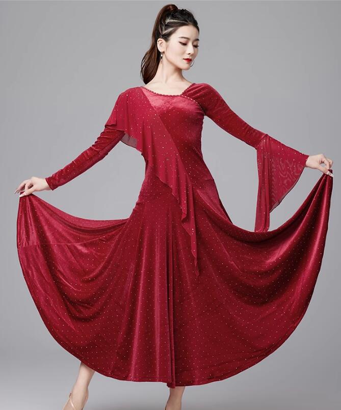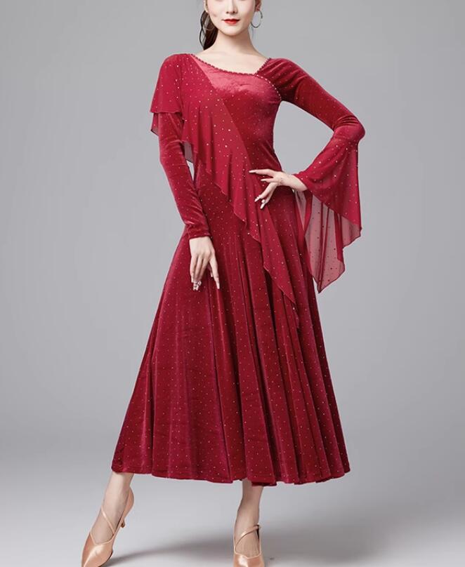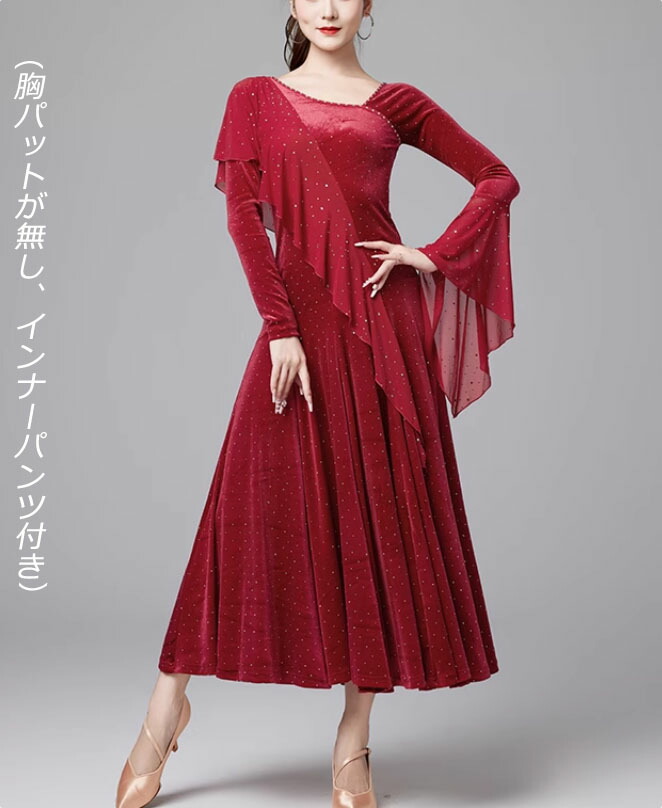 社交ダンスドレス ラインストーン飾り ベルベット 長袖 社交ダンス フラメンコ ドレス 社交ダンス衣装 モダンダンス衣装 ワルツドレス 広がる裾 ダンスドレス レッスン着 スタンダード