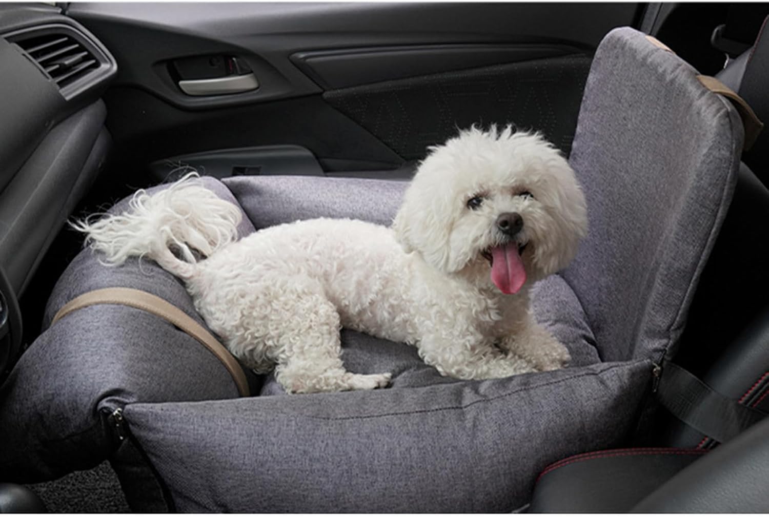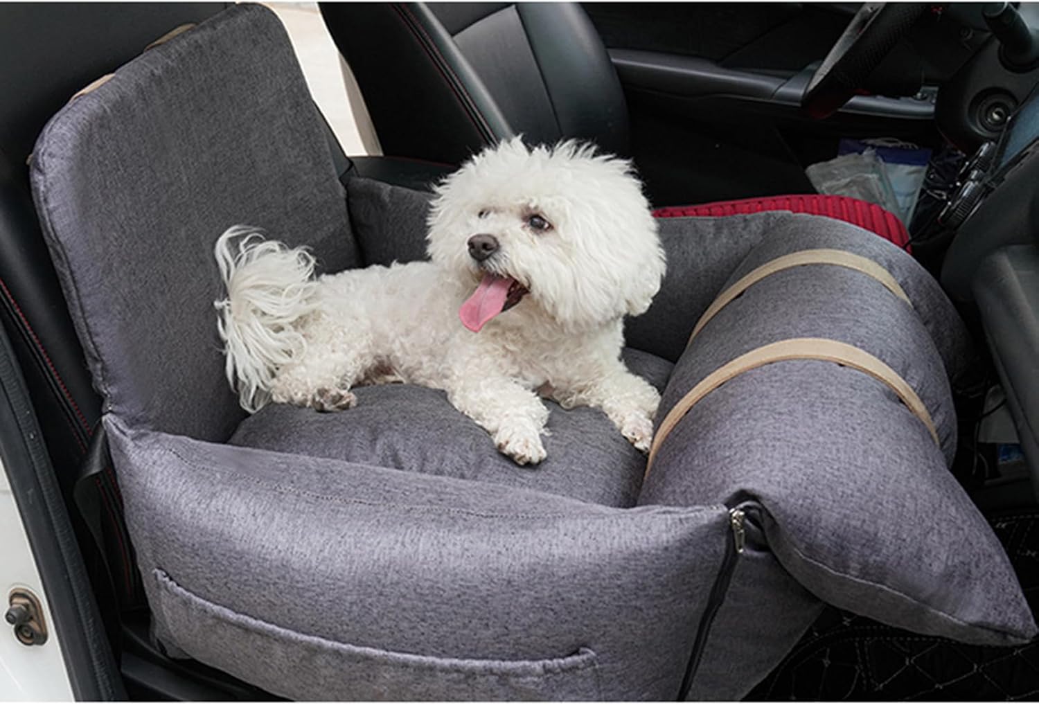 □シートベルトを通すことで、しっかり座席に固定して、ショルダーストラップをヘッドレストにかけて固定できます。また、シート中に飛び出し防止のリードも付き、ドライブする時、犬や猫ちゃんが車酔いなどの心配がありません。