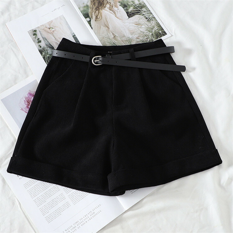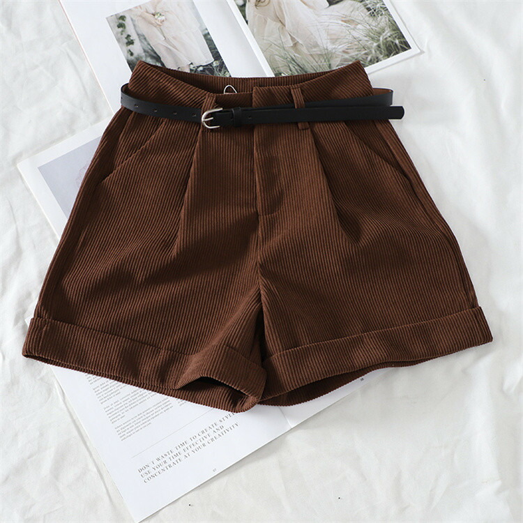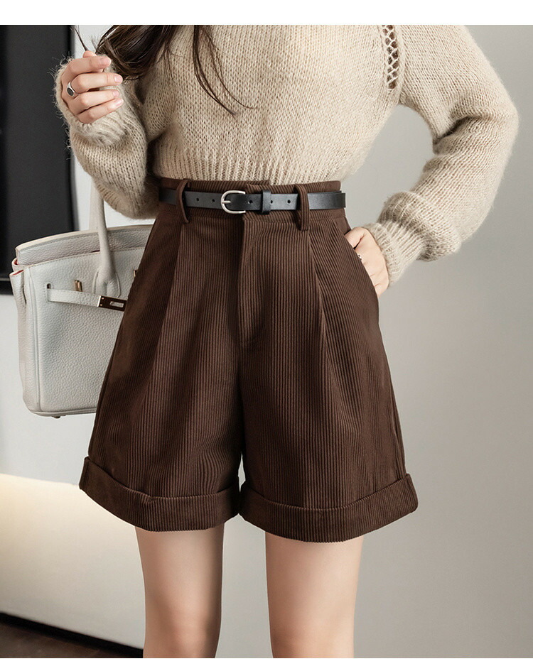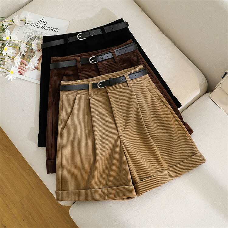 パンツ ショートパンツ レディース 秋冬 ハーフパンツ 短パン ハイウエスト コーデュロイ フェイクレザー 膝上 ボトムス ロールアップ ポケット ゆったり タック ブラック ブラウン カーキ キャメ