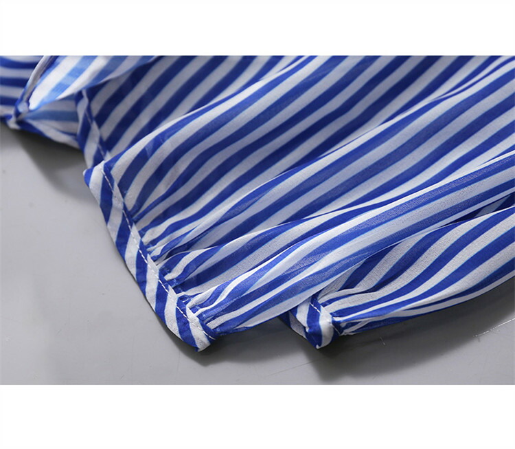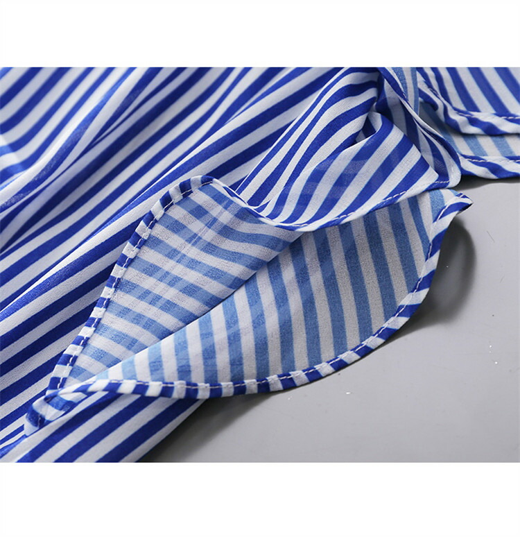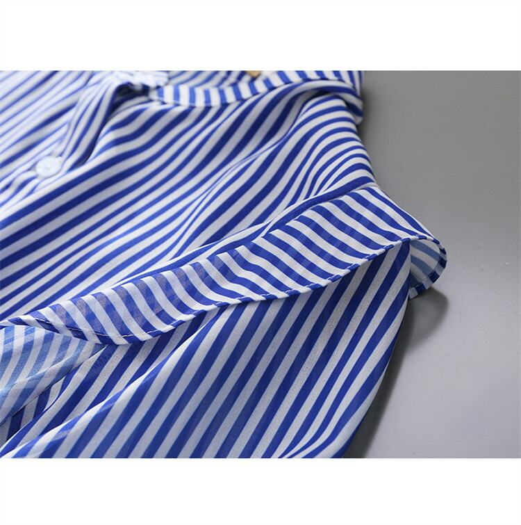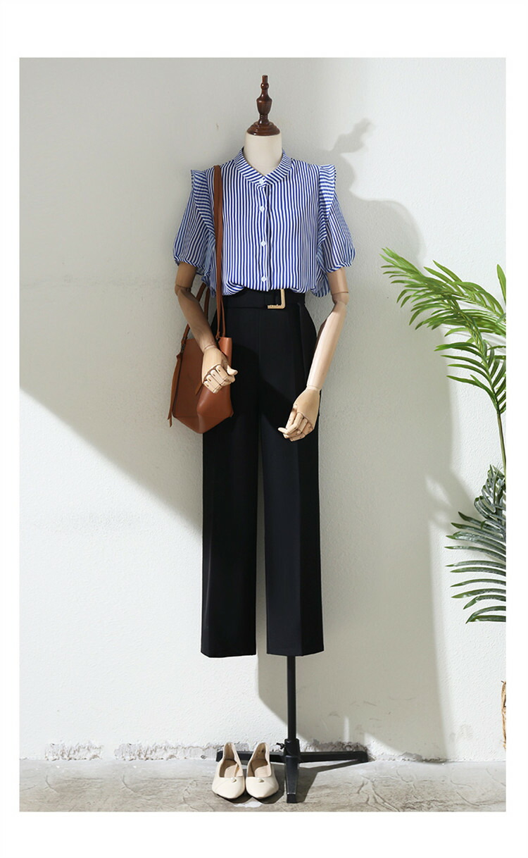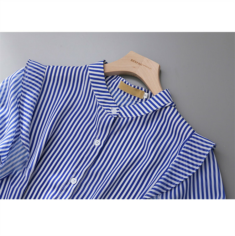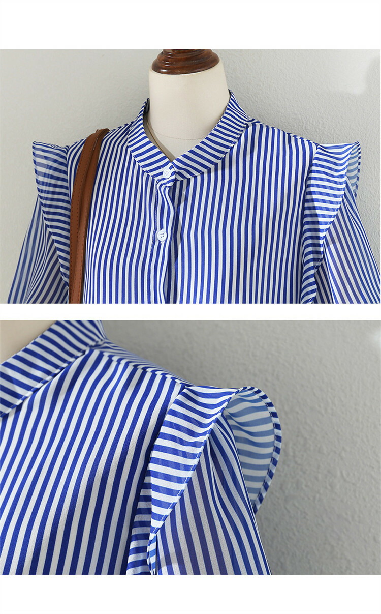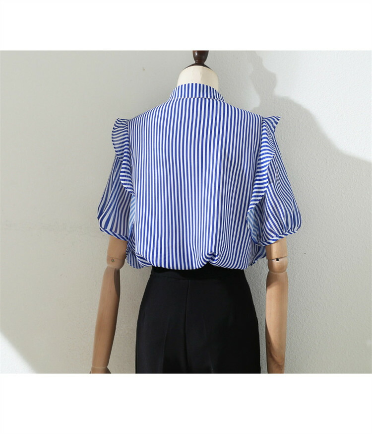 シャツ ストライプ レディース トップス ブラウス 半袖 バンドカラー スタンドカラー 薄手 フリル ゆったり 春 夏 秋 柄 ストライプ柄 バンドカラーシャツ