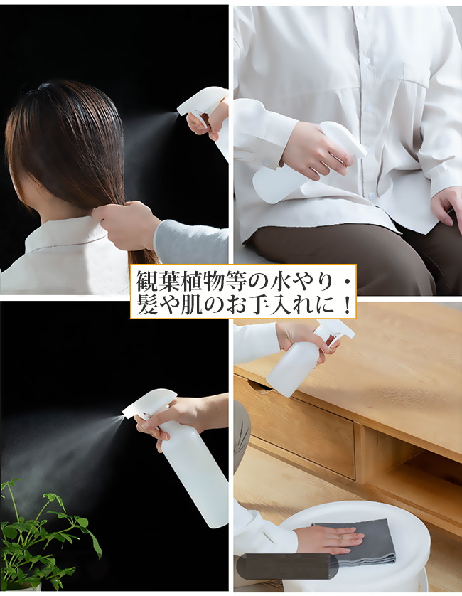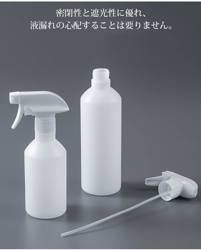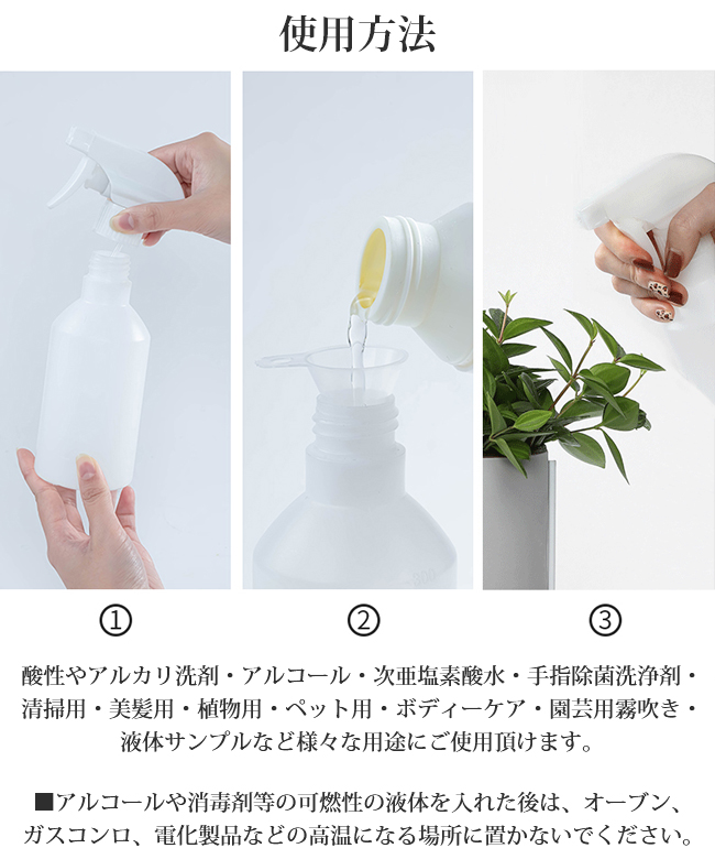 酸性やアルカリ洗剤・アルコール・次亜塩素酸水・手指除菌洗浄剤・清掃用・美髪用・植物用・ペット用・ボディーケア・園芸用霧吹き・液体サンプルなど様々な用途にご使用頂けます。