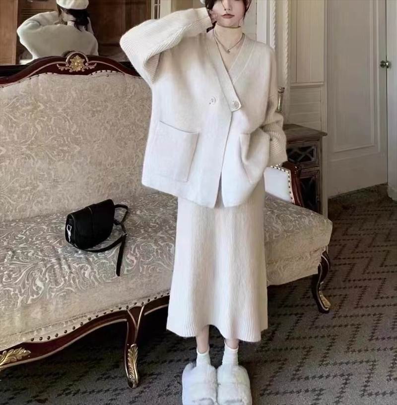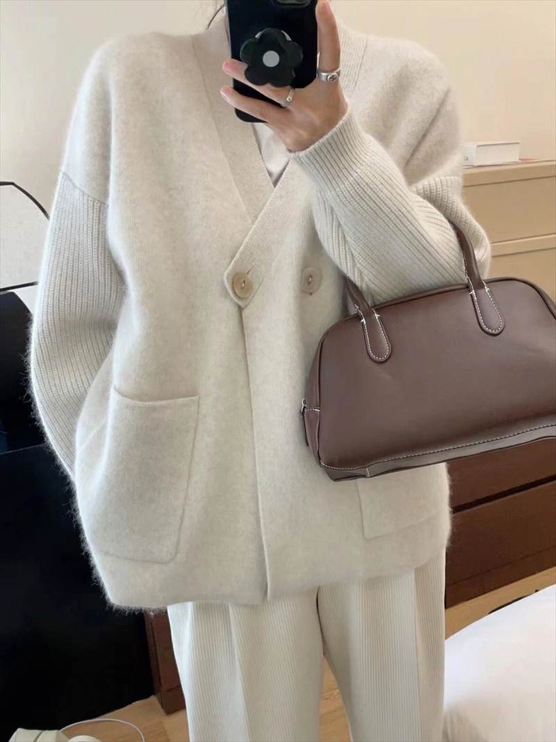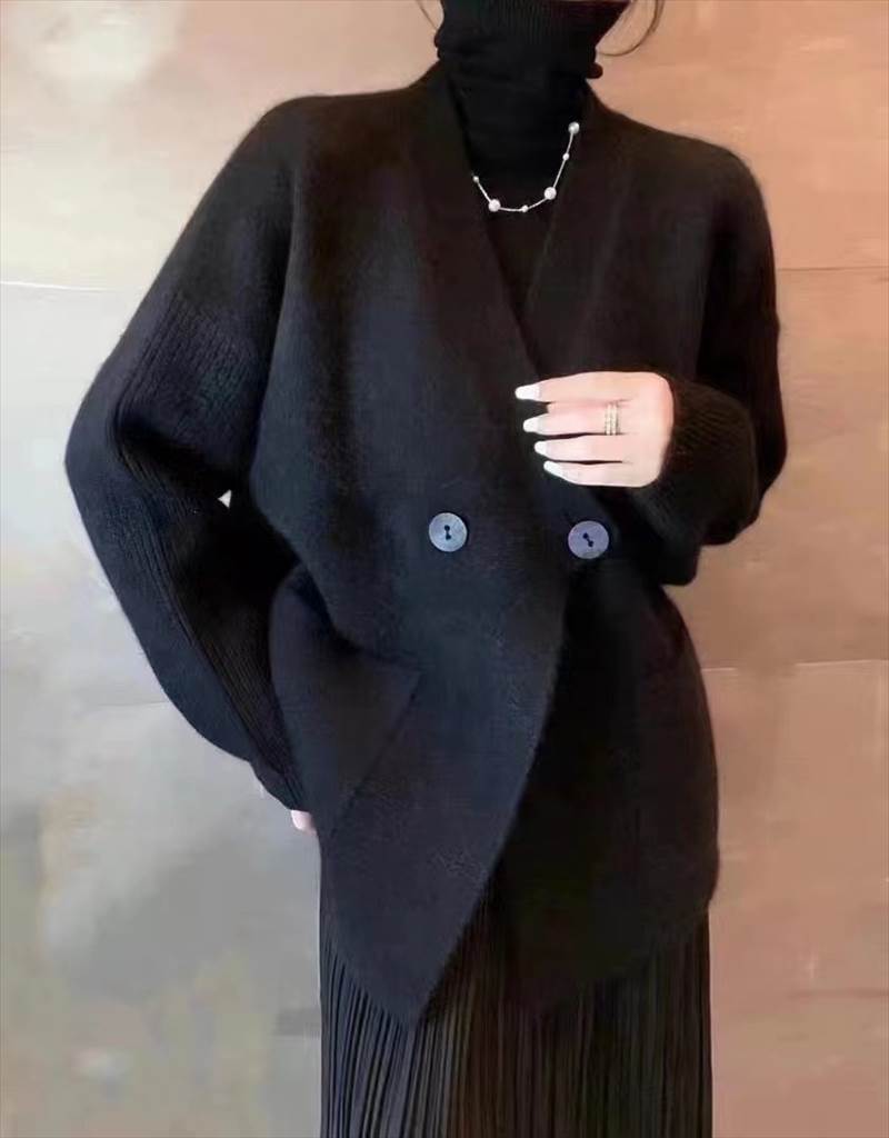 このカーディガンは、シンプルで上品なダブルボタンのデザインが魅力。