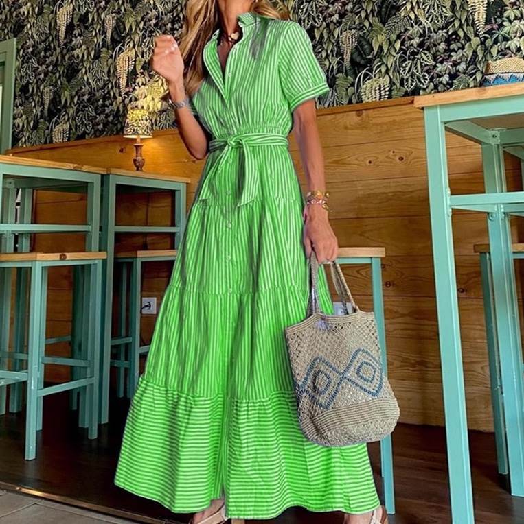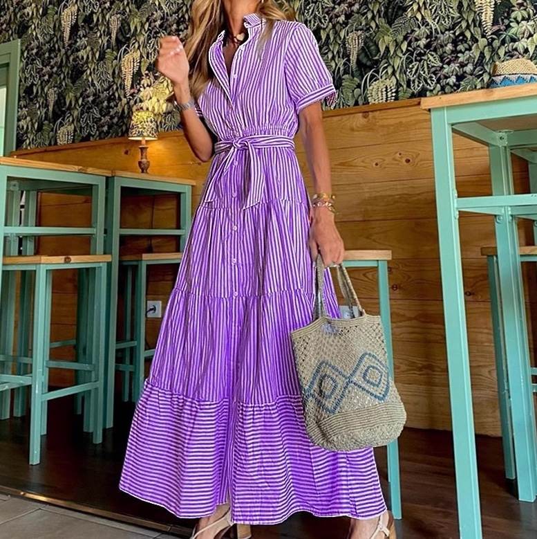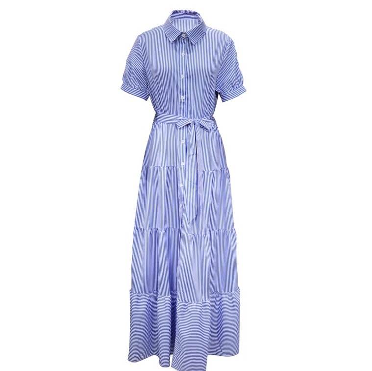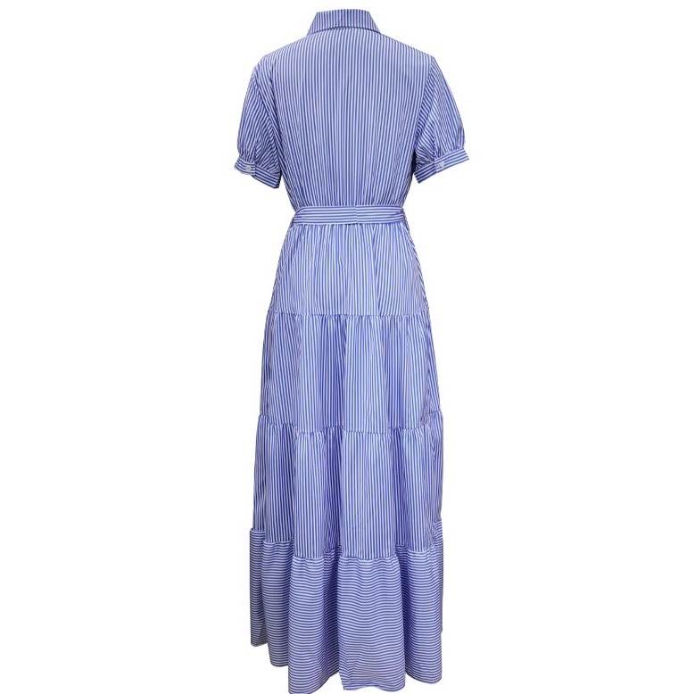 レディース ワンピース シャツワンピ フレア ティアード ロング マキシ 半袖 Vネック 襟付き フレア ウエストマーク ウエストリボン ハイウエスト 切り替えデザイン ベルト付き 大人可愛い カジュアル おしゃれ かっこいい こなれ感 ラフ マニッシュ アクティブ ナチュラル ボーダー ストライプ 夏 ママ お出かけ アウトドア イベント リゾート 旅行 海 ビーチ 公園 女子会 休日 バカンス 楽ちん 体型カバー 普段使い 着回し S M L XL 紫 水色 ブルー 緑 グリーン 春カラー パープル