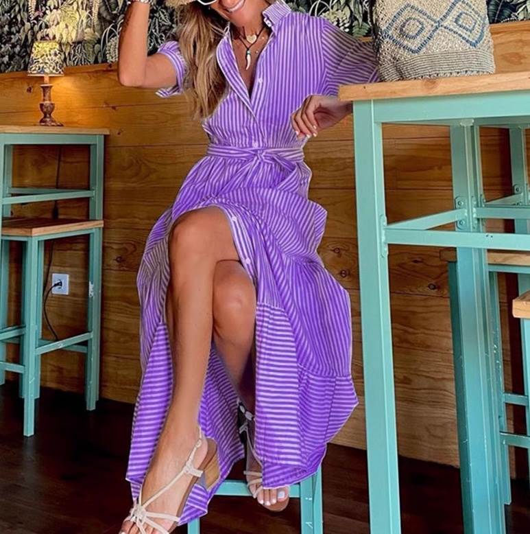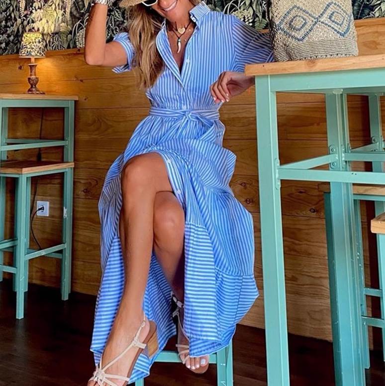 夏のリゾートやビーチで大活躍!大人可愛いロングシャツワンピースが登場。フレアティアードデザインとウエストリボンで、女性らしいウエストマークを演出。Vネックと襟付きが上品さをプラスし、こなれ感も抜群。カジュアルからマニッシュ、アクティブまで、あらゆるスタイルにマッチ!ストライプ柄のボーダーデザインが、さわやかな夏を引き立てる。サイズ展開も豊富でSからXLまで対応。