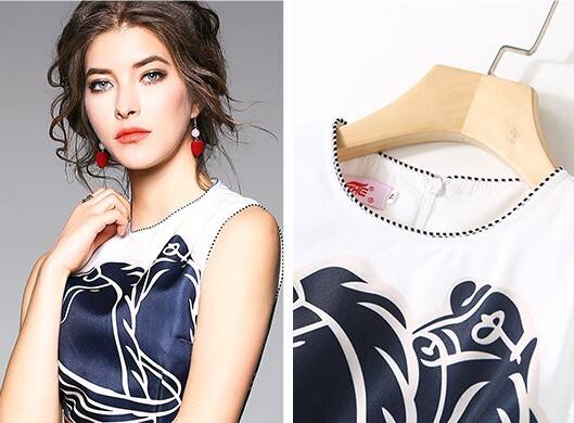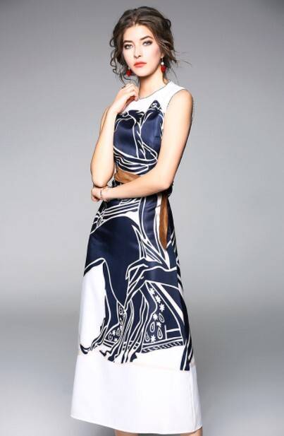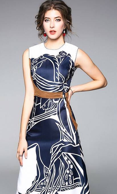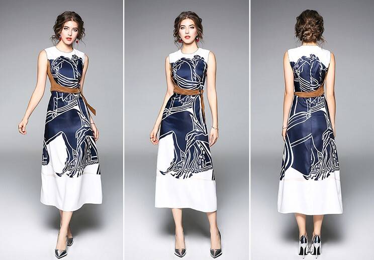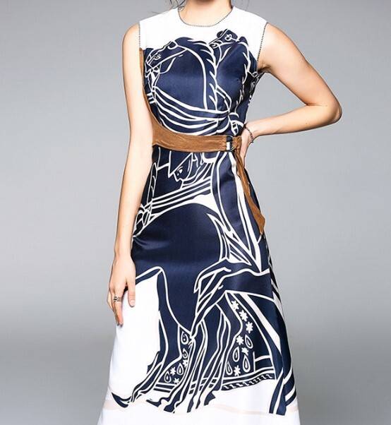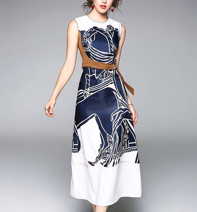 ワンピース ロング ロング丈 マキシ マキシ丈 9分丈 アンクル丈 袖なし ノースリーブ ラウンドネック ストレート ベルト ウエストマーク ファスナー ハイウエスト 異素材MIX かっこいい 個性的 モード系 存在感 柄 夏 10代 20代 レディース お出かけ 休日 リゾート 旅行 ファッション コーデ スタイル インスタ映え S M L XL 青 ブルー Aライン スリムドレス