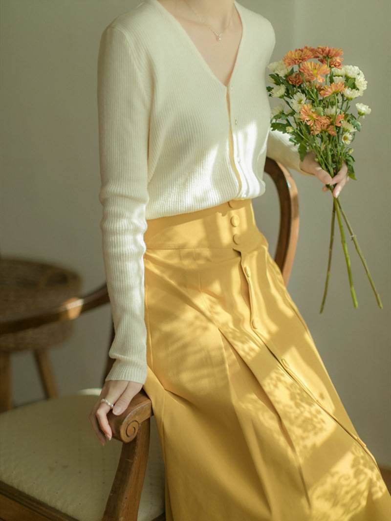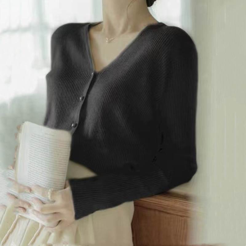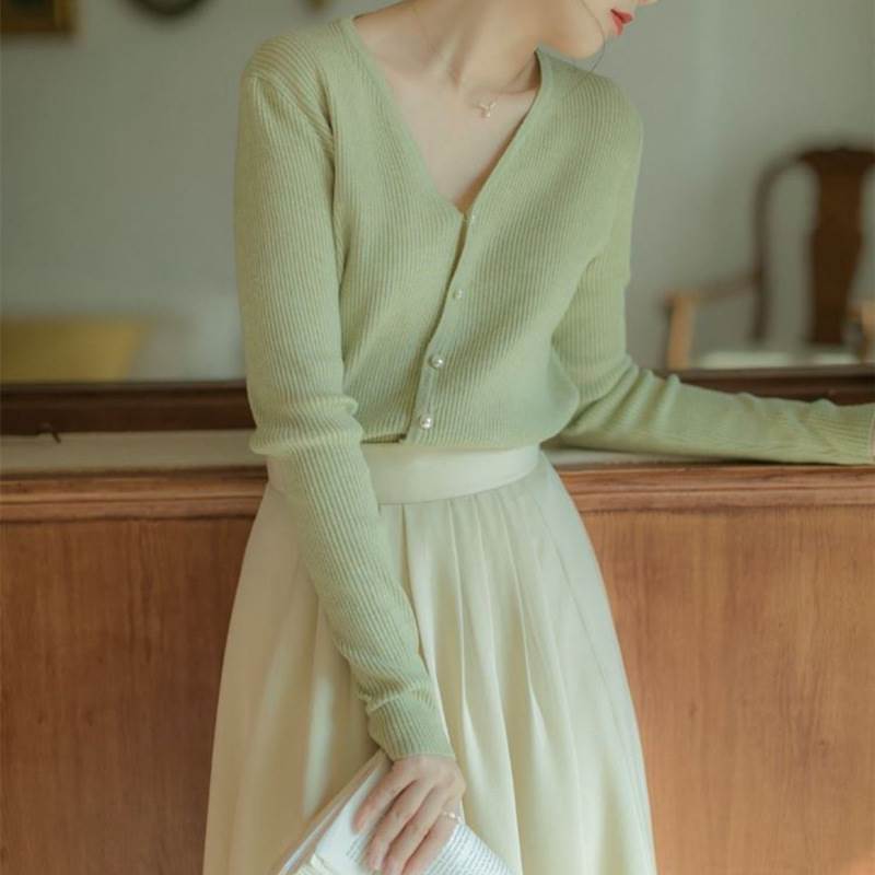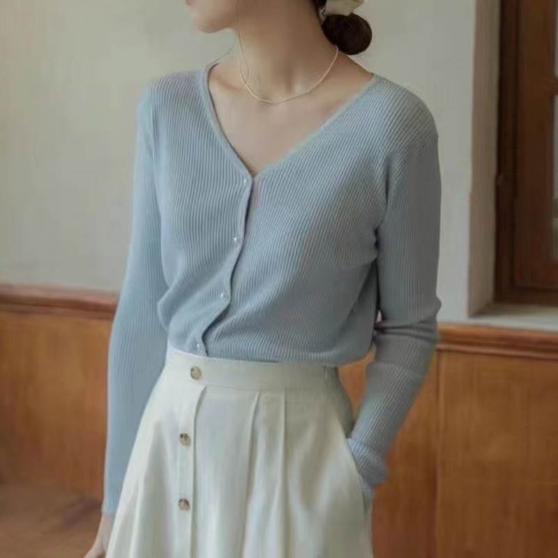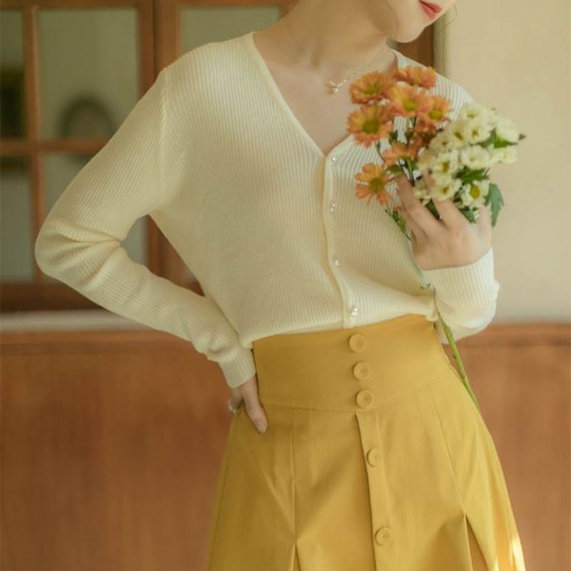 このVネックのカーディガンは、シンプルで上品ながらも、デザインボタンがさりげないアクセントとなり、個性的な雰囲気を演出します。