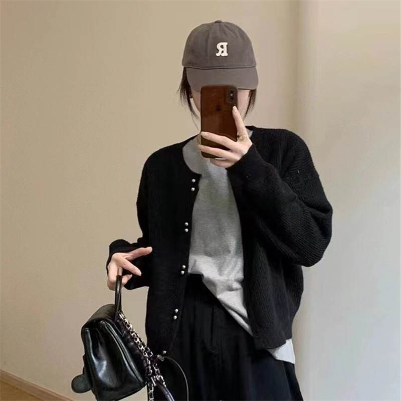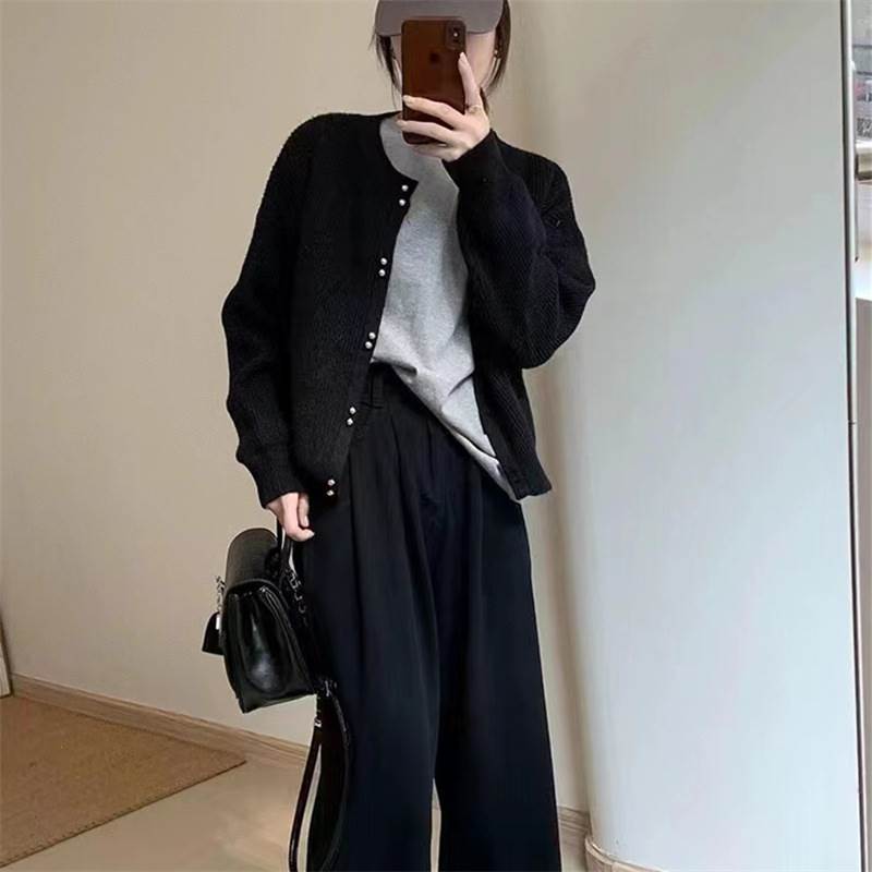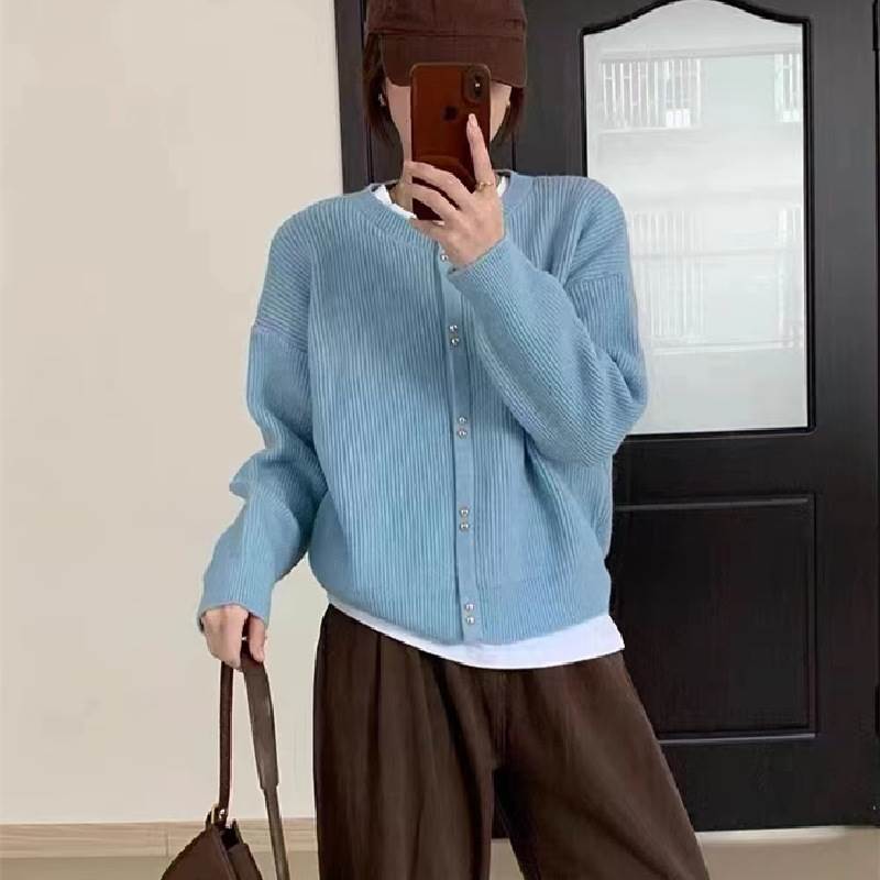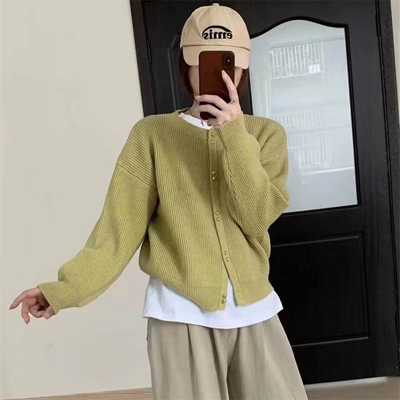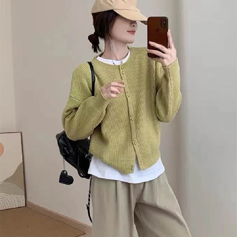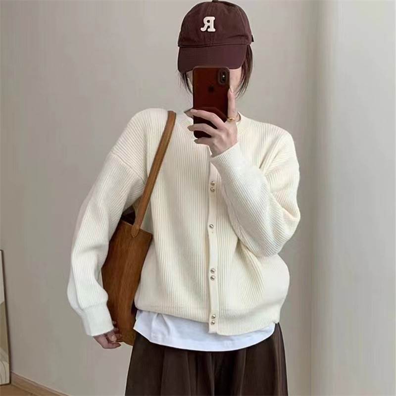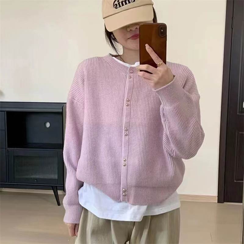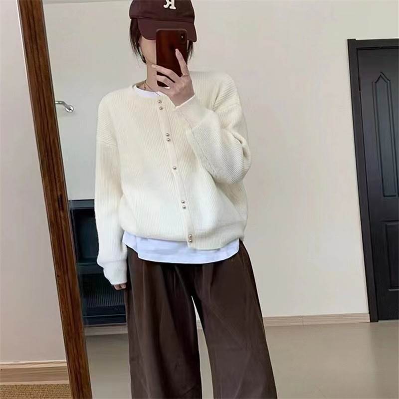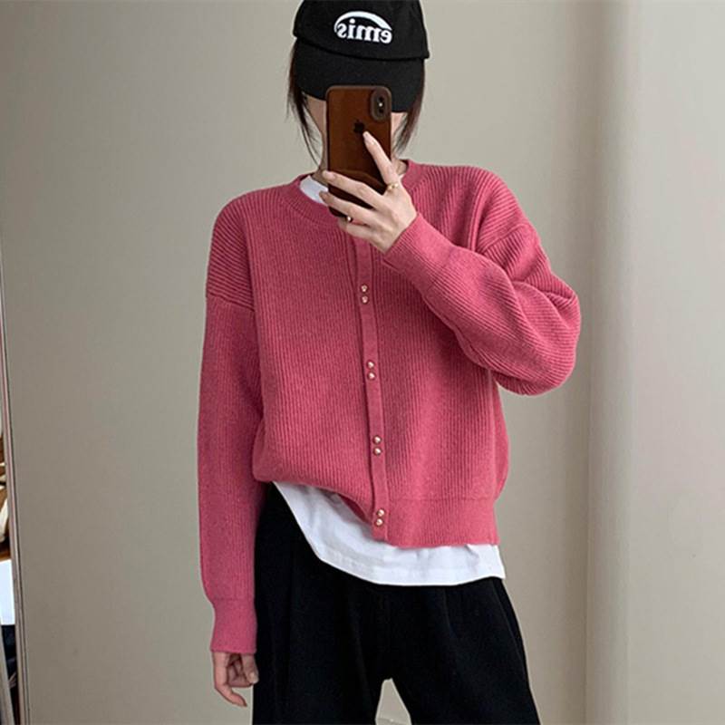 このラウンドネックの前開きカーディガンは、秋冬シーズンにぴったりの定番アイテム。