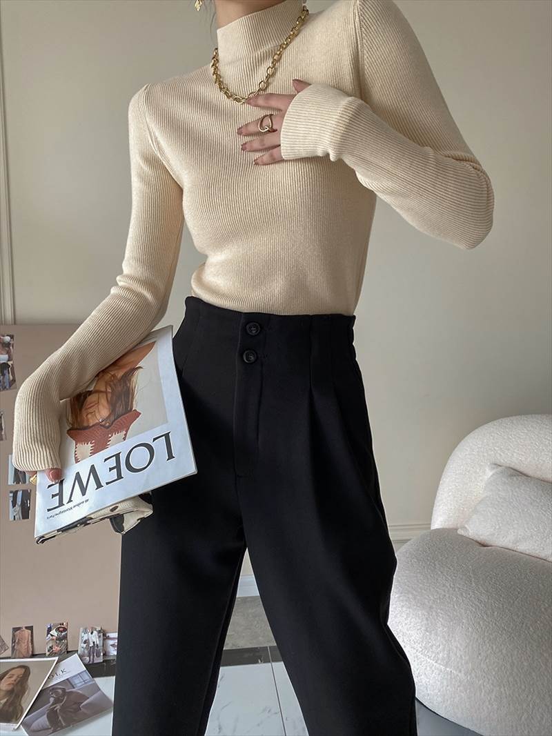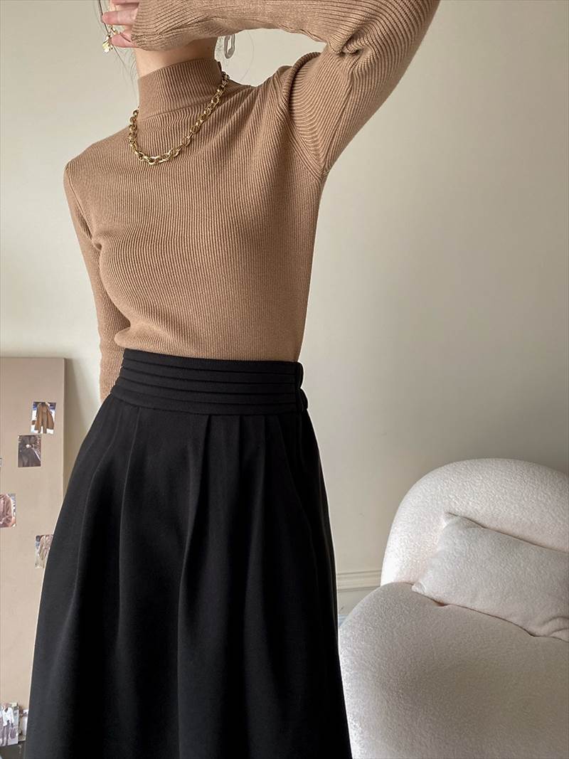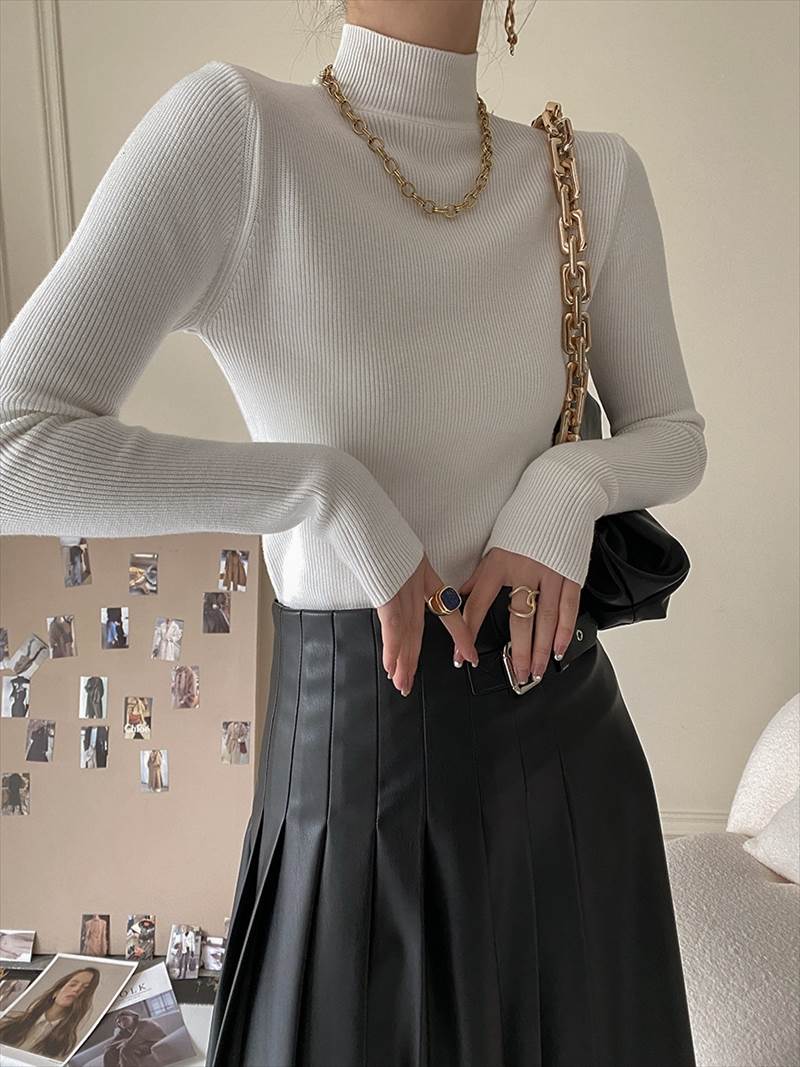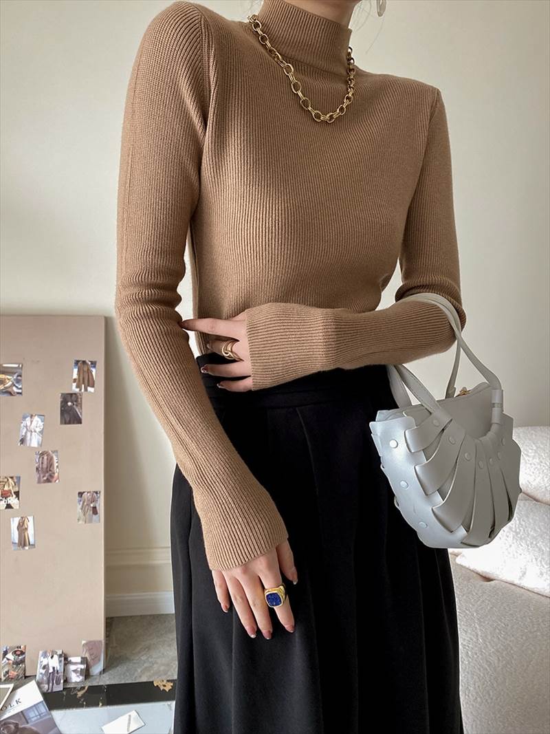 大人可愛いを演出する ニットソーは、爽やかなハイネックデザインが特徴のミディアム丈プルオーバーです!