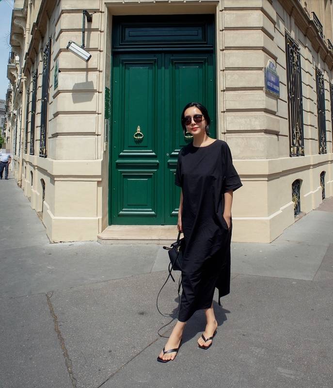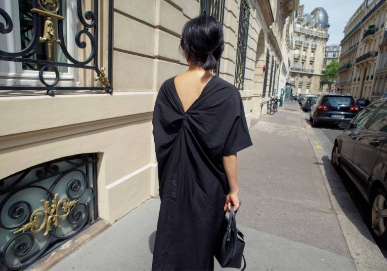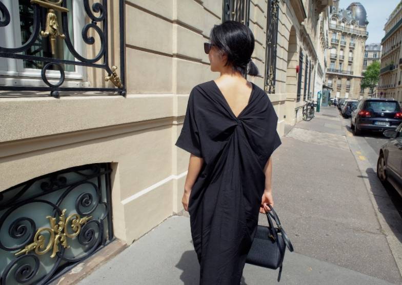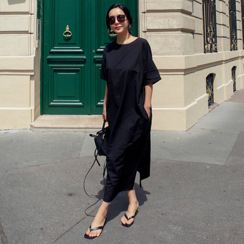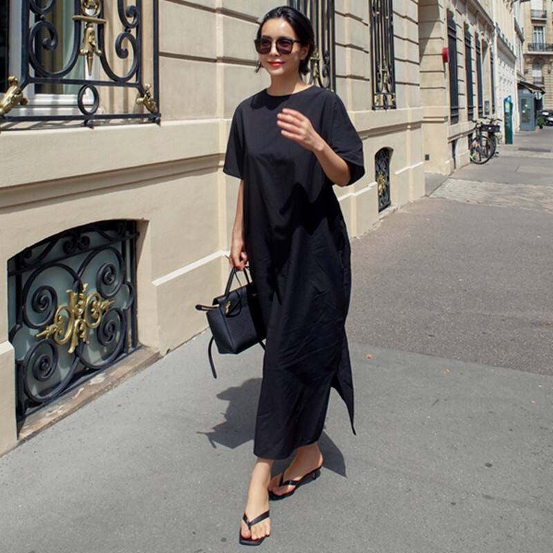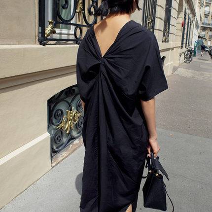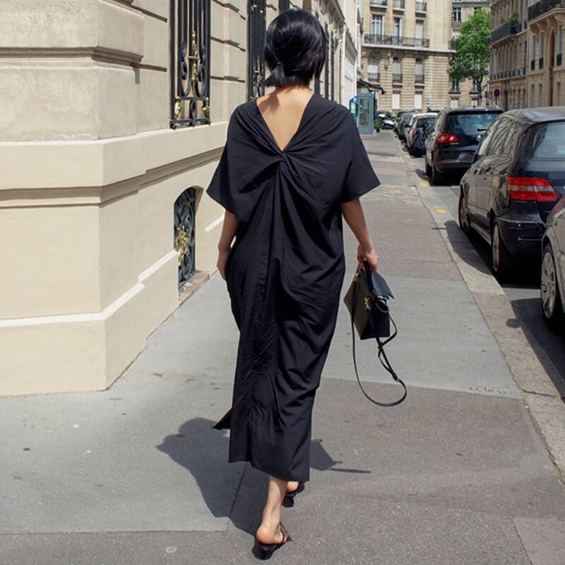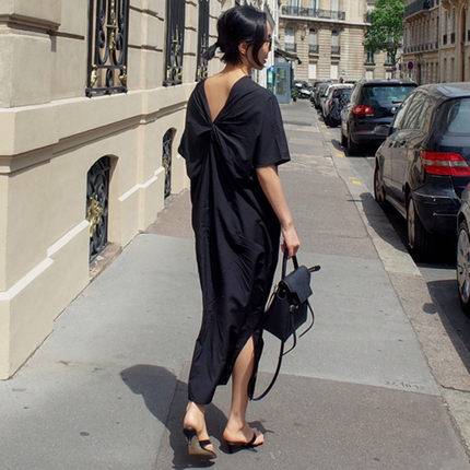 バックシャン ワンピース 半袖 ロング丈 レディース 夏 無地 ブラック ラウンドネック スリット 背中見せ イベント 休日 お出かけ コーデ 普段使い ファッション おし