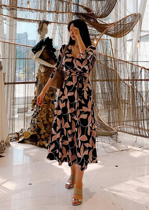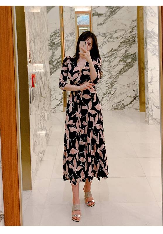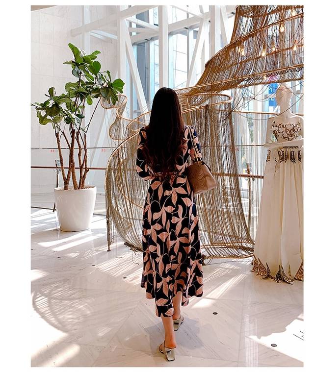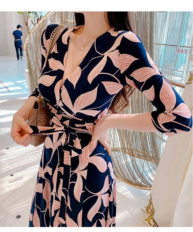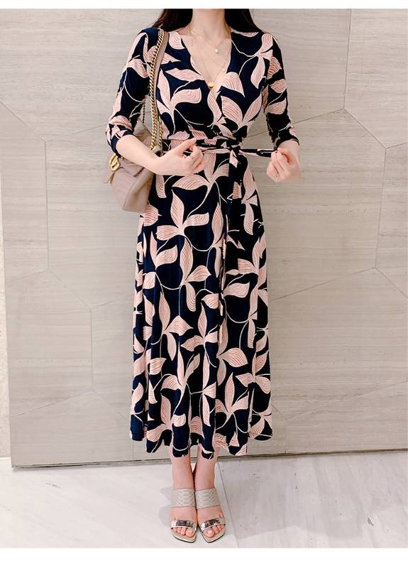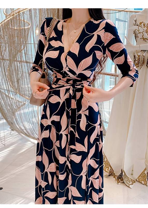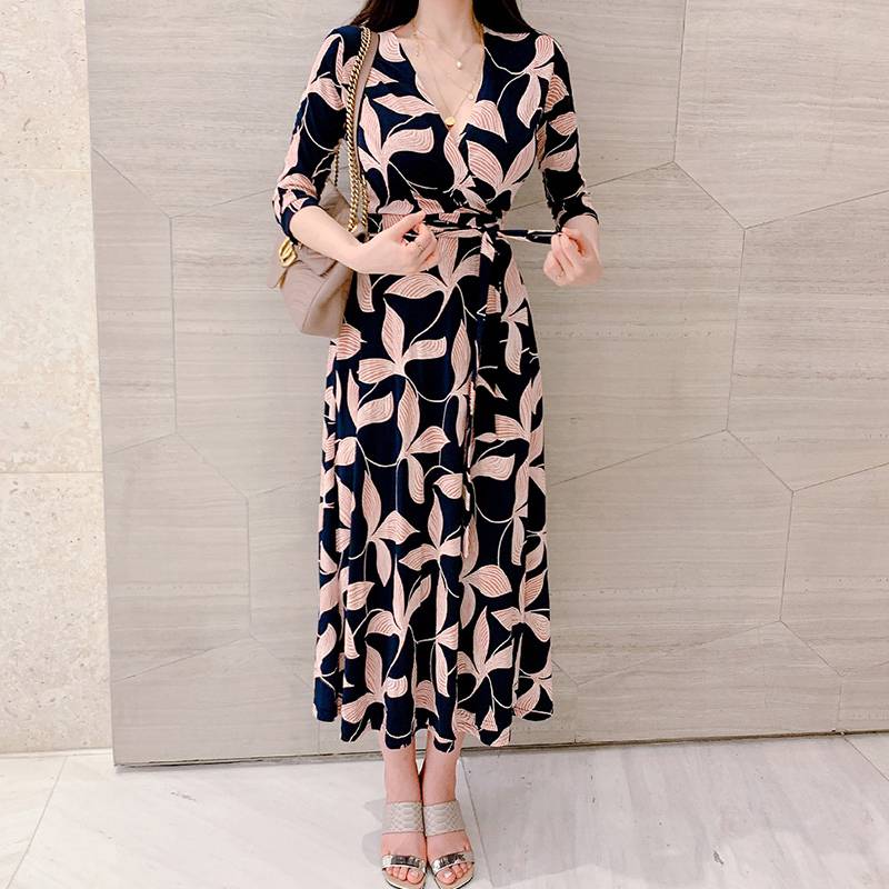 ロング ワンピース 七分袖 レディース 春 秋 ボタニカル Vネック Aライン フレア ウエストリボン ハイウエスト イベント 休日 お出かけ デート コーデ 普段使い 女子