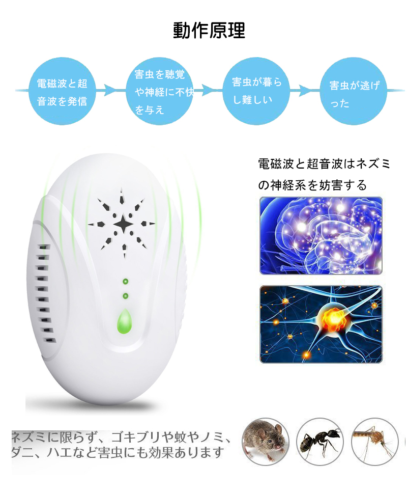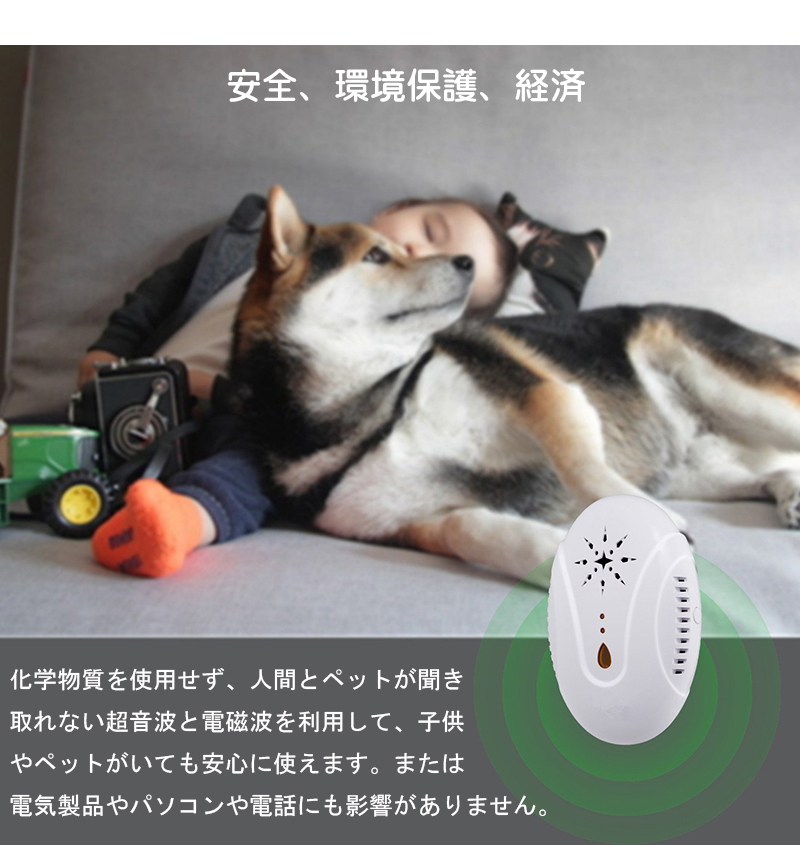 ◆【安全、環境保護、経済】化学物質を使用せず、人間と犬猫が聞き取れない超音波と電磁波を利用して、子供やペットがいても安心に使えます。または電気製品やパソコンや電話にも影響がありません。
