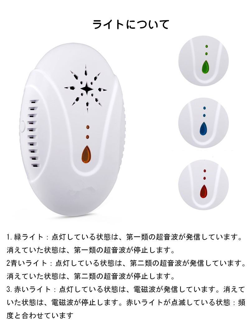 ◆【PSE認証済み+三つのモード】PSE認証済みなので、安心にご使用ください。本装置の発生モードは三つあってに切り替えます。緑ライト:軽度の害虫がある状況(人とペットが聞こえない)青いライト:中度の害虫がある状況(人とペットが聞こえない)赤のモード:重度の害虫がある状況(人とペットが聞こえる}ですので、人とペットがいれば、赤いライトを設定しないでください。