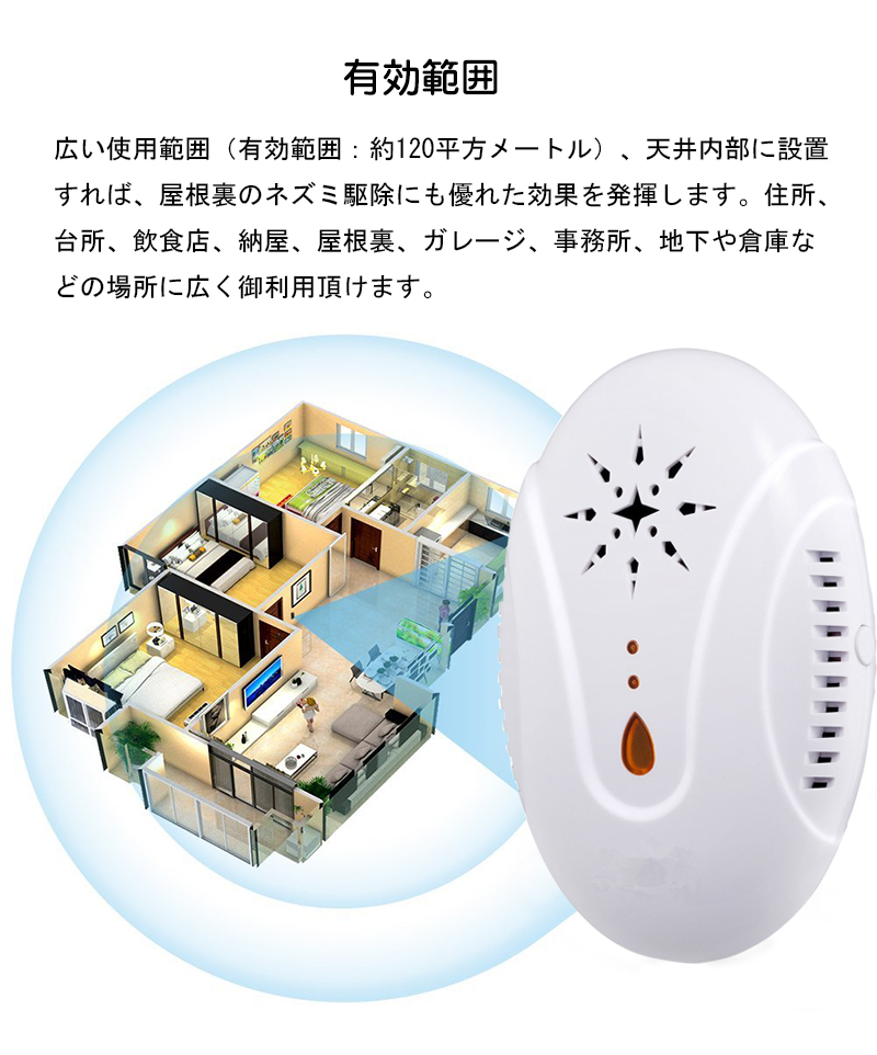 ◆【操作簡単】:コンセントに差し込むだけで使用できます。電池や充電も不要、省エネのデザインです。有効範囲120平方メートルです。ねずみだけではなく、ゴキブリ、蚊、ノミ、ダニ、シロアリ、ハチ、クモ、コウモリなど有害生物にも効果あります!天井内部に設置すれば、屋根裏のネズミ駆除にも優れた効果を発揮します。住所、台所、飲食店、納屋、屋根裏、ガレージ、事務所、地下や倉庫などの場所に広く御利用頂けます。