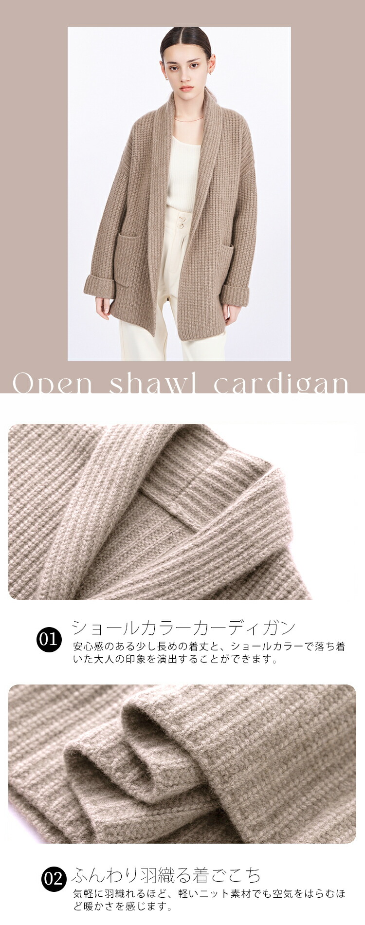 安心感のある少し長めの着丈と、ショールカラーで落ち着いた大人の印象を演出することができます。