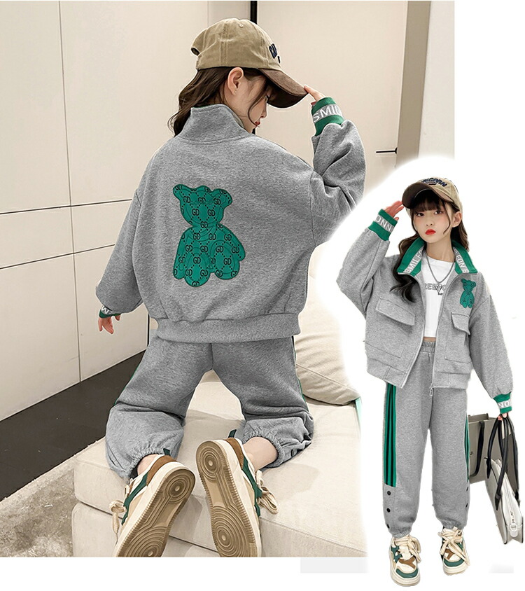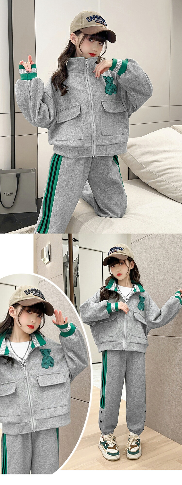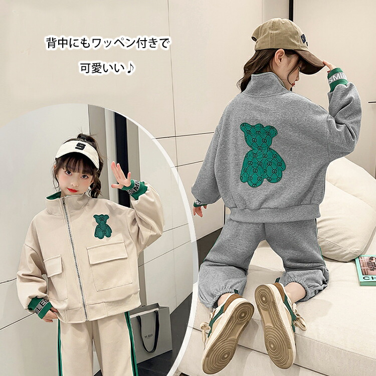 グリーンのクマわっぺんが特徴のキッズセットアップ。