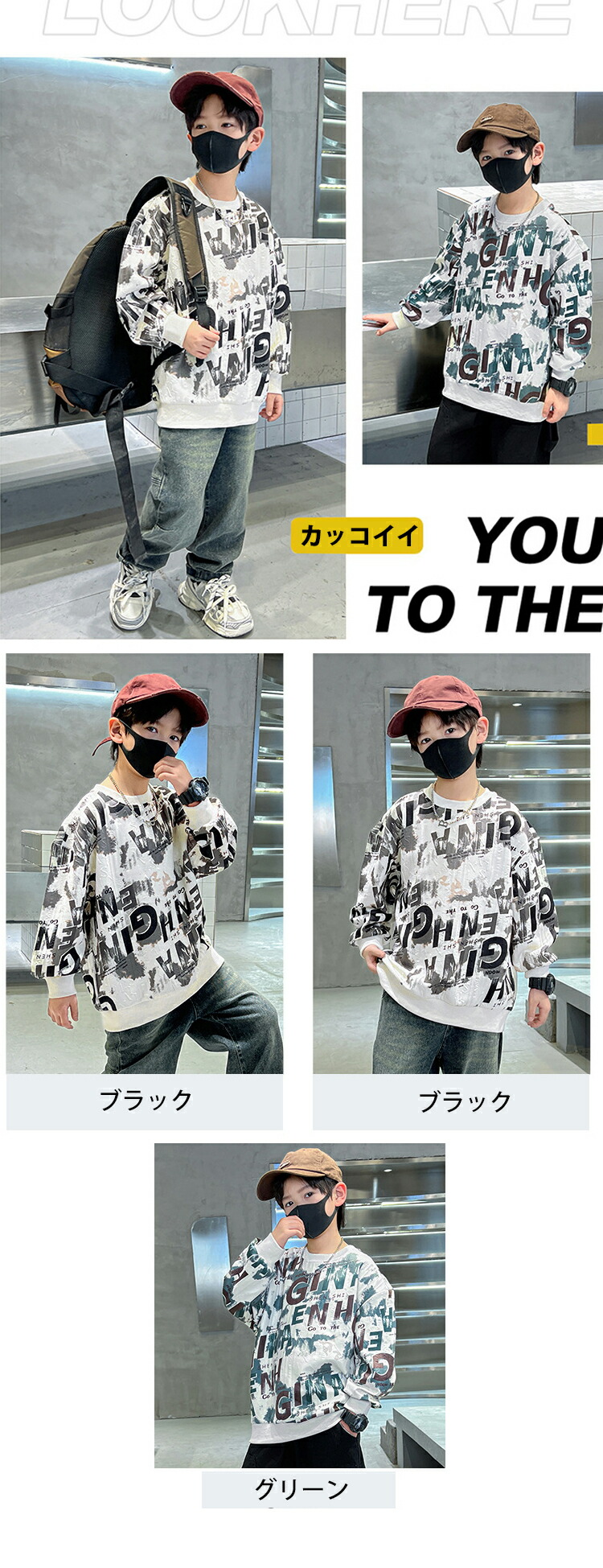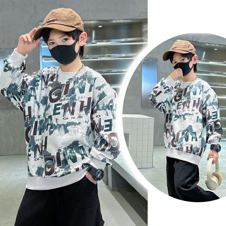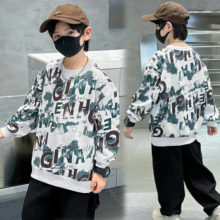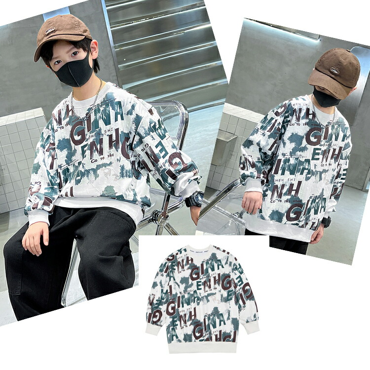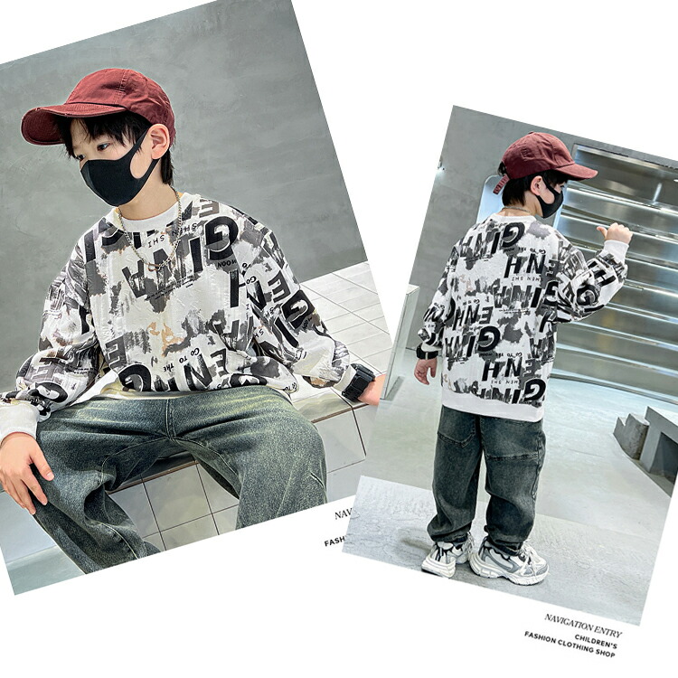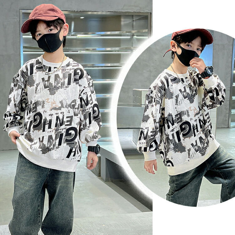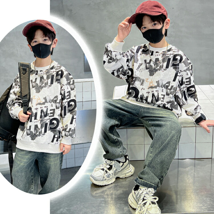 2カラー 6サイズ キッズトップス キッズ プリントトレーナー 英文字 インク風 秋冬 トップス キッズトレーナー プリント トレーナー 長袖 プリント文字 袖口 リブ ラウンドネック