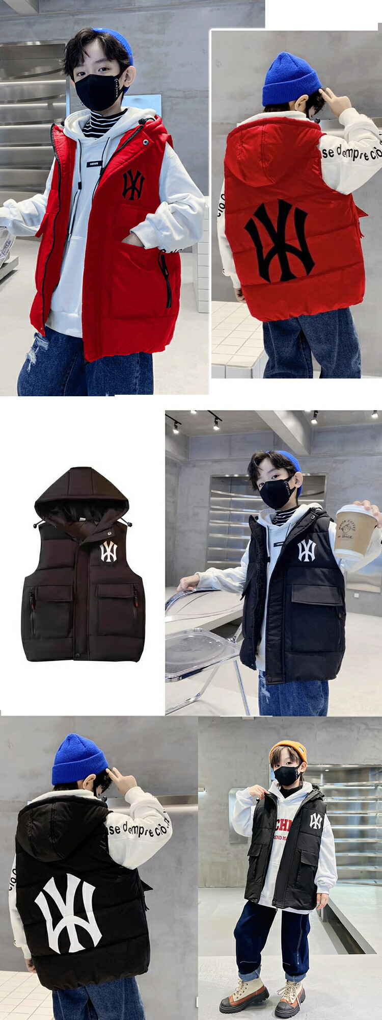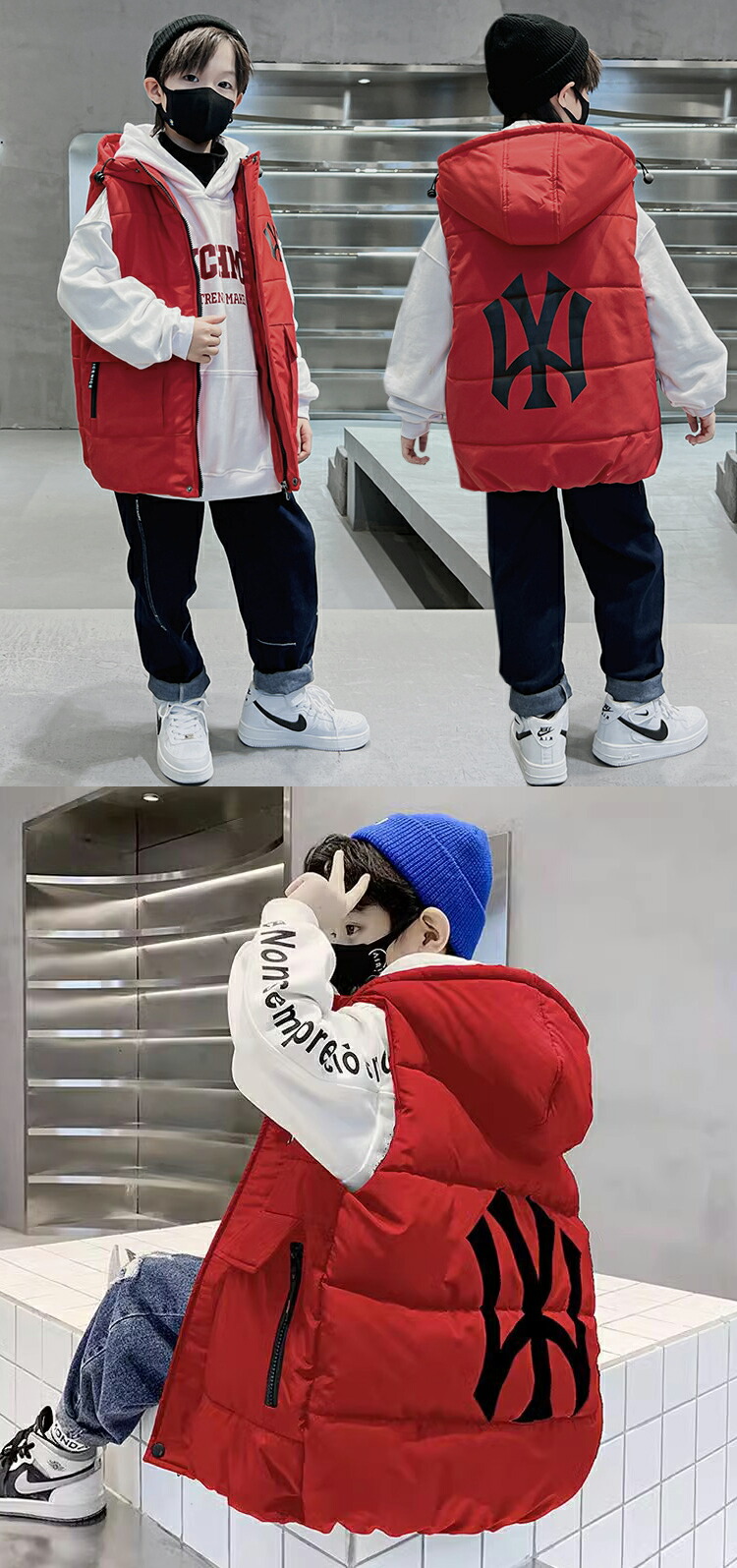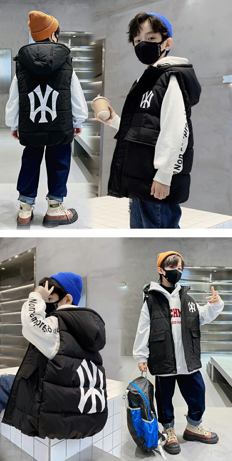 ☆2点目300円OFFクーポン☆キッズアウター ダウンベスト フェイクダウン 中綿 アウター キッズベスト 秋冬 ノースリーブ 上着 ポケット付き プリントロゴ ファスナー ジップ 暖かい