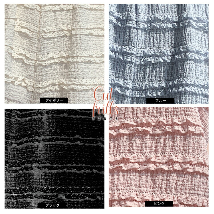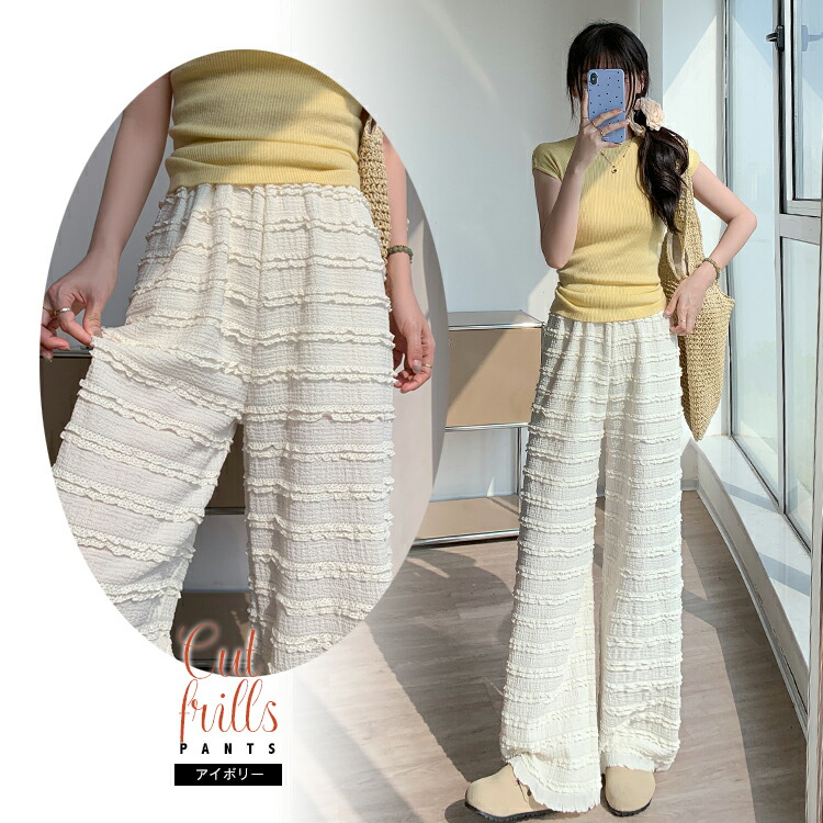 カットフリル ワイドパンツ レディース ハイウエスト ワイドパンツ ミルフィーユ レース フリル ボトムス 春夏 ゆるふわ フレアパンツ ロング丈 ウエストゴム レイヤード 重ね着