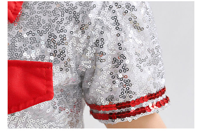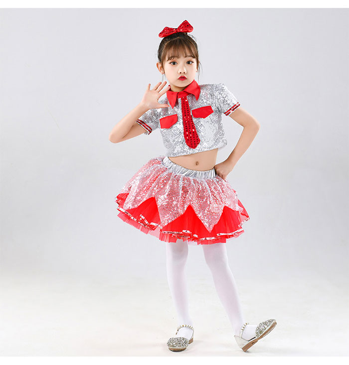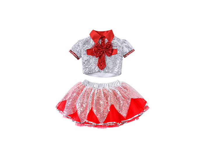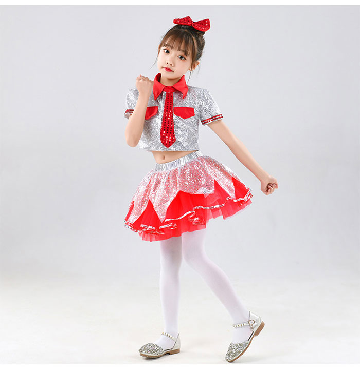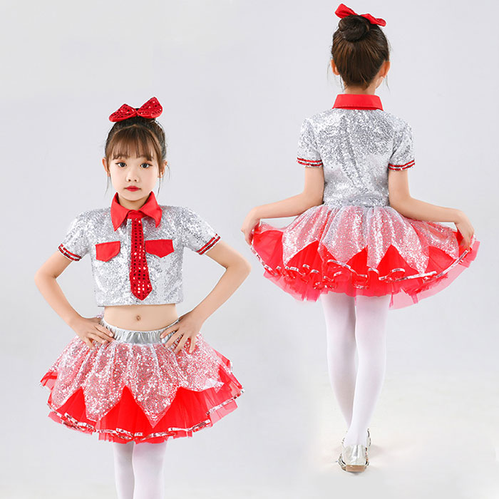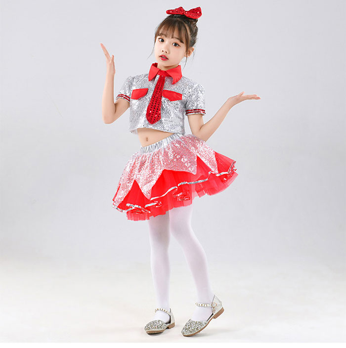 子供 ダンス衣装 チア 女の子 キッズ ダンス 発表会 かわいい セットアップ スパンコール ステージ衣装 舞台衣装 女の子 半袖 ショート丈 トップス チュチュスカート シルバー レッド 衣装 子ど