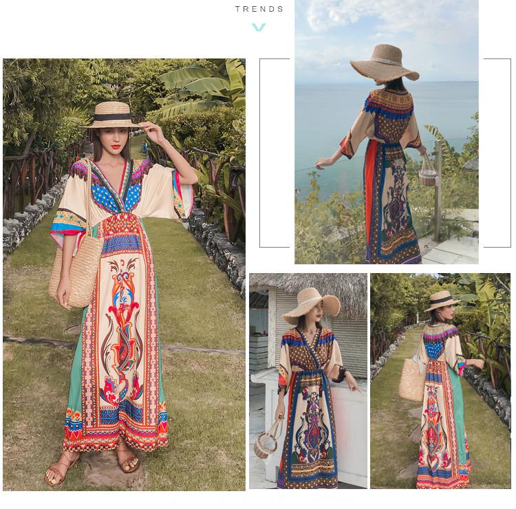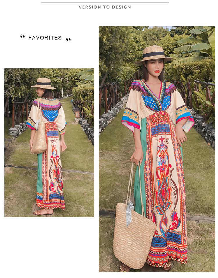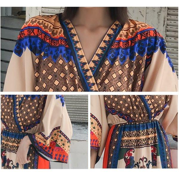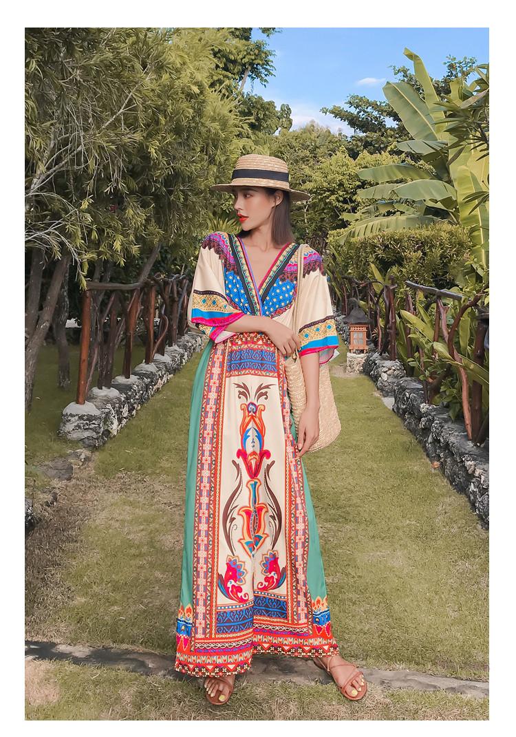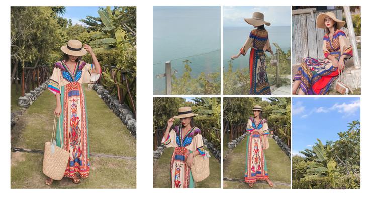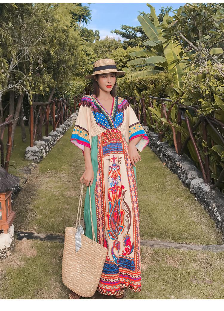 「送料無料」【chuutenn】リゾートワンピース Vネック ビーチ リゾート タイ 民族風 ロング丈 マキシワンピース 五分袖 ギャザー入り ウエストゴム 夏新作 エスニック マキシワンピース レディース ロング丈ワンピース カジュアル ワンピース キレイめ 大人 海 S/M/L/XL/XXL