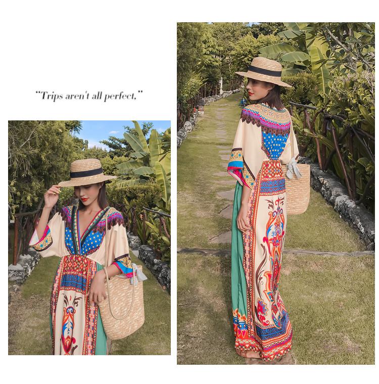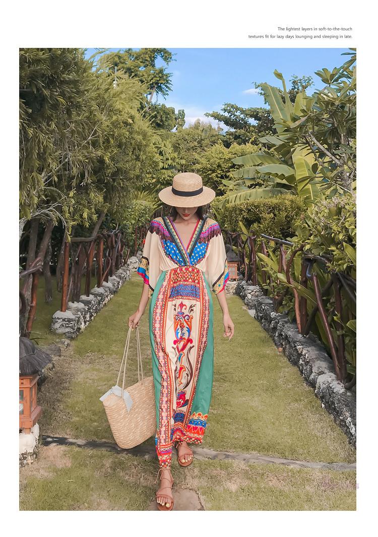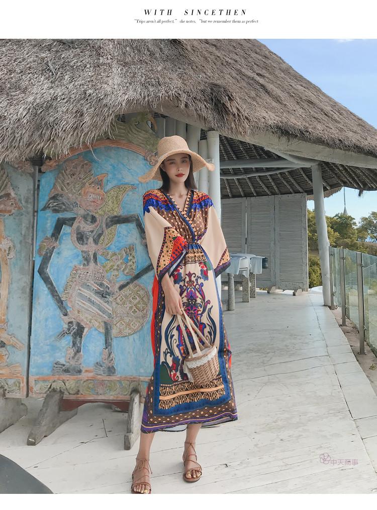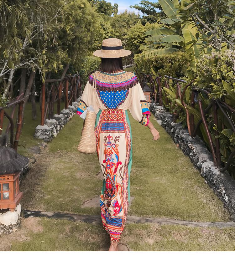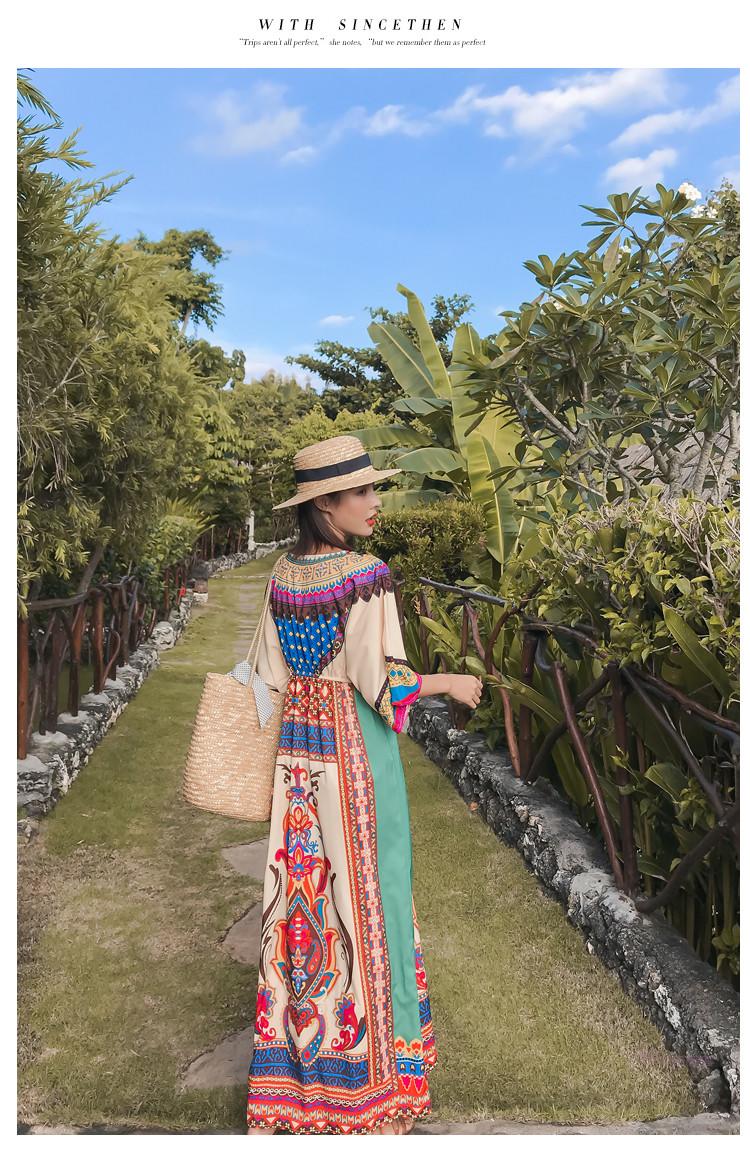 「送料無料」【chuutenn】リゾートワンピース Vネック ビーチ リゾート タイ 民族風 ロング丈 マキシワンピース 五分袖 ギャザー入り ウエストゴム 夏新作 エスニック マキシワンピース レディース ロング丈ワンピース カジュアル ワンピース キレイめ 大人 海 S/M/L/XL/XXL