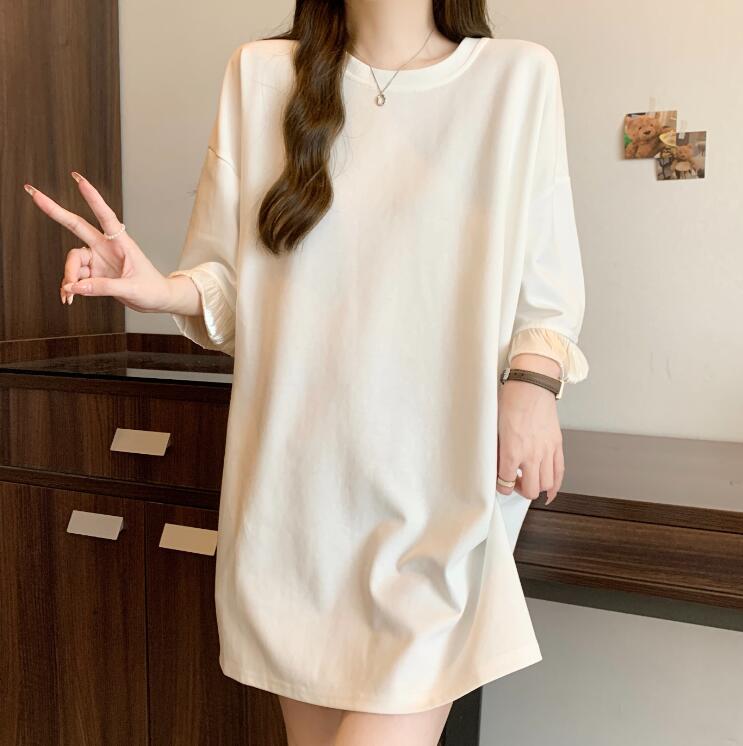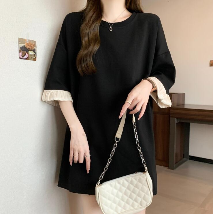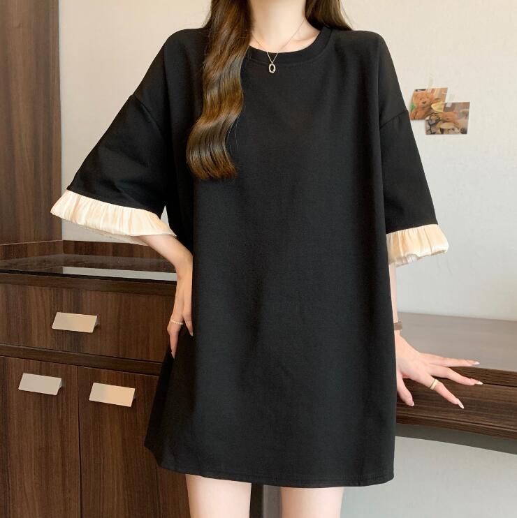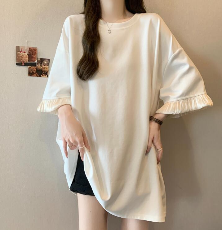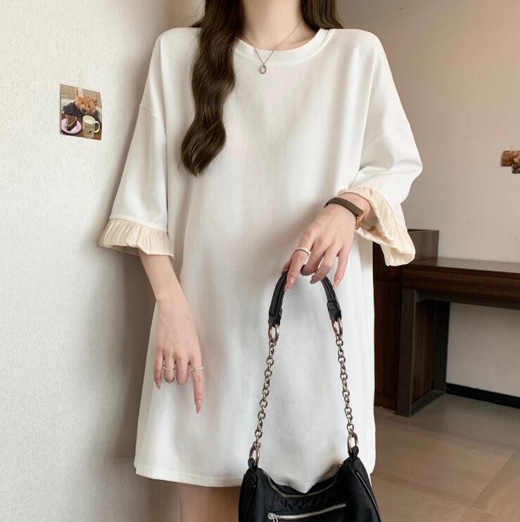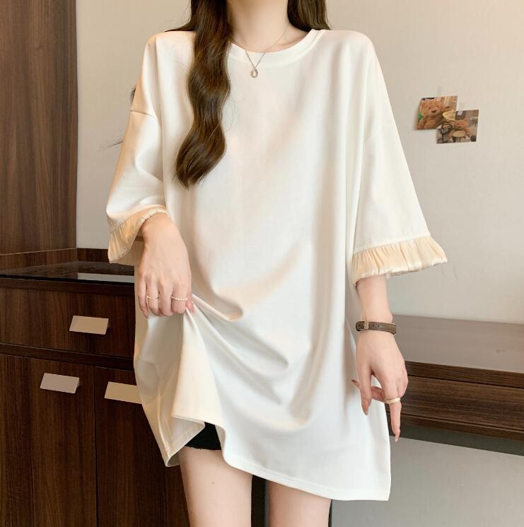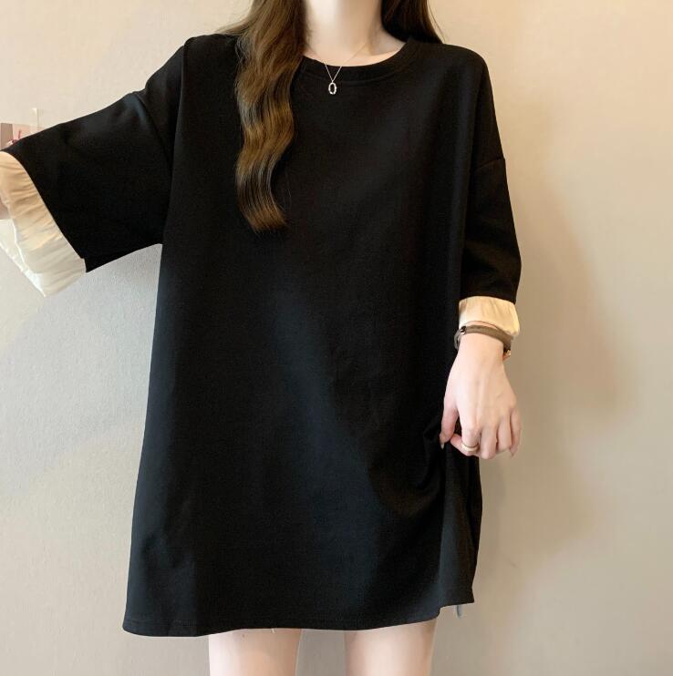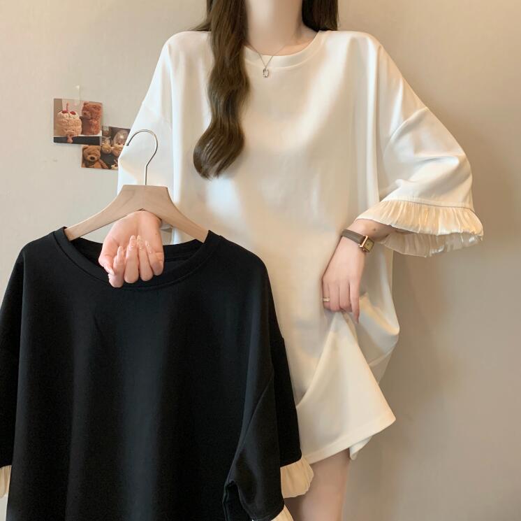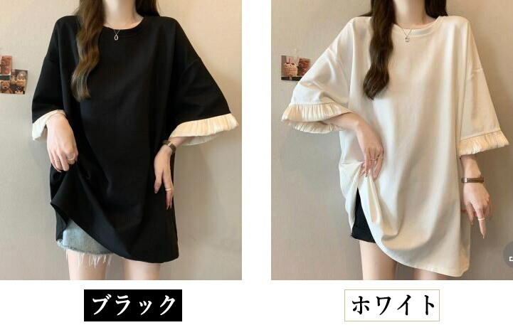 Tシャツ レディース 半袖 夏 切替 ロング フリル袖 ゆるTシャツ カットソー クルーネック ビッグシルエットカジュアル シンプル 大きサイズ M L 2L 3L 4L 5L