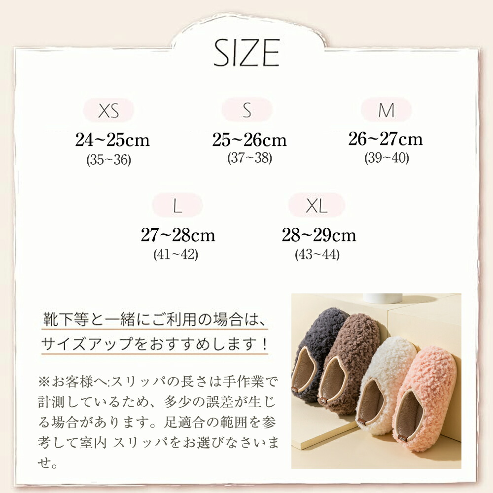 商品情報【ふわふわのエコファー】 ふわふわもこもこで、とても温かいです。私は冷え性なので、いつも冬が辛いのですが、このスリッパなら温かいので安心です。靴底がゴム製なので、浴室のちょっとした用事も履いたまま済ませることができます。【履き心地が柔らかであったかい】 履き心地は柔らかくて、毛羽だっているので暖かい。本当に暖かくて、足先がつつまれてる感じも柔らかくて。中がふわふわでとっても履き心地がいいので気に入ってます。【靴底がゴム製なので】 ソールはゴム素材が使われているので滑りにくく、スリッパ特有のペタペタといった音もないのでとても静かです。【こちらのスリッパに変えて一度も滑ってません】 しっかり足の先をホールドしてくれるので、歩きやすく脱げません。足裏部がしっかりしているので、スリッパのへたりが少なく、長持ちしそうです。コスパが良いと思います。【幅広い用途】 サイズもカラーも豊富なのでご家族の皆様に適用できます。また、可愛くておしゃれなデザインなので、冬の来客用スリッパとしても、新婚や新築のお祝い、友人や恋人へのプレゼントとしても好評。