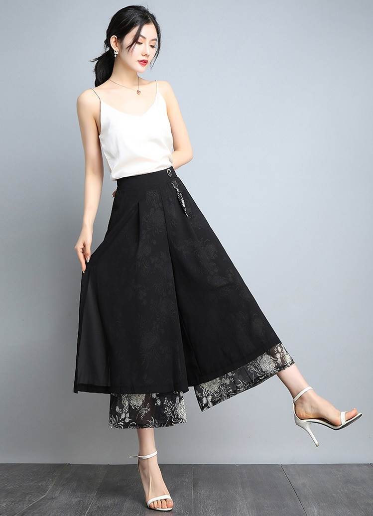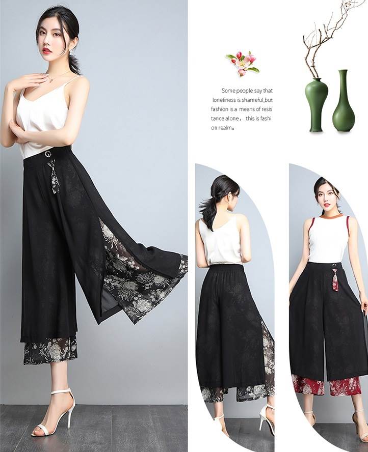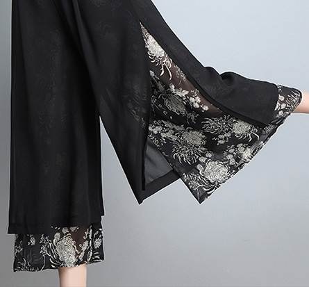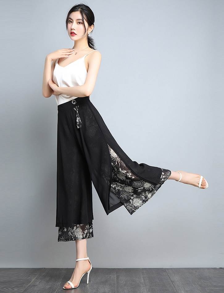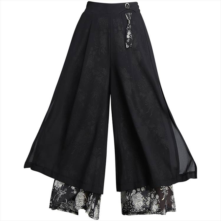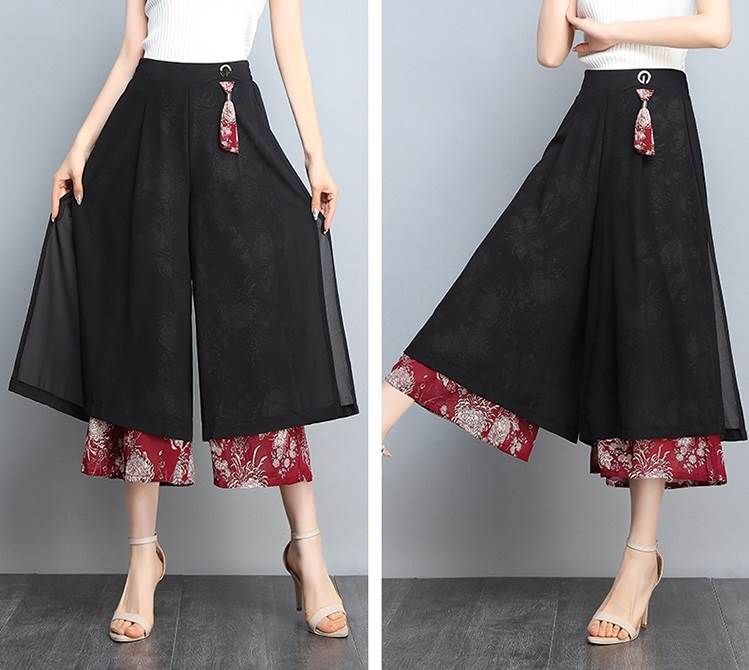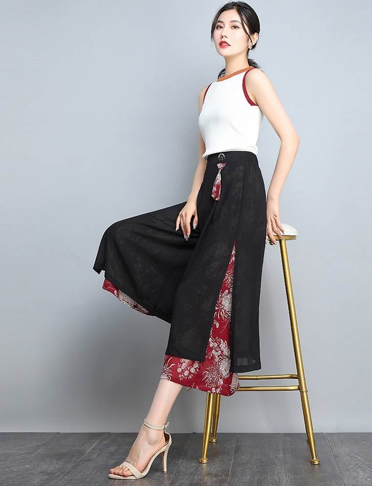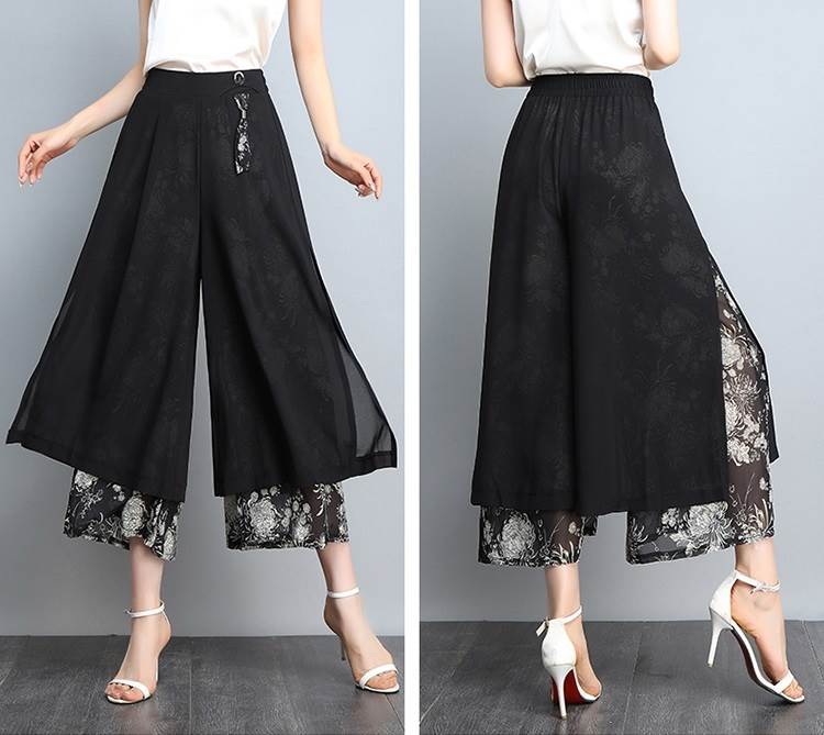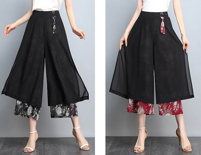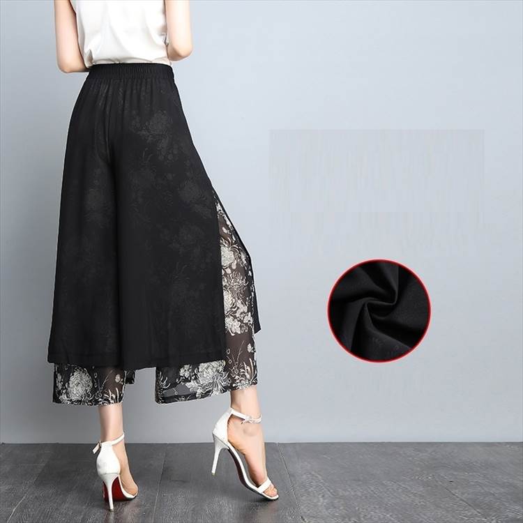 レイヤード クロップドパンツ ボトムス パンツ ズボン ワイドパンツ 7分丈 ワイド シフォン スリット サイドスリット ポケット ハイウエスト 透け感 シースルー きれいめ カジュアル 大人 おしゃれ お洒落 大人女子 こなれ感 ルーズ 個性的 存在感 柄 花柄 春 夏 秋 30代 40代 50代 60代 レディース ママ 通勤 デート お出かけ 公園デビュー 女子会 休日 旅行 着回し 普段使い 韓国 韓国系 ゆったり 大きいサイズ M L XL 2XL 3XL 黒 ブラック 赤 レッド