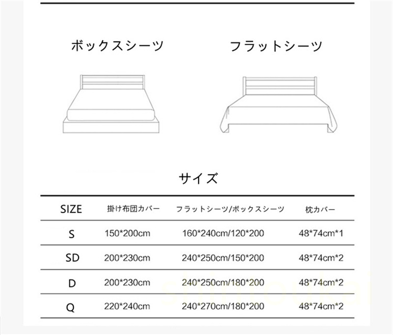 horizontal-key: 【S】フラットシーツ 【SD/D】フラットシーツ 【Q】フラットシーツ 【S】ボックスシーツ 【SD】ボックスシーツ 【D】ボックスシーツ 【Q】ボックスシーツ