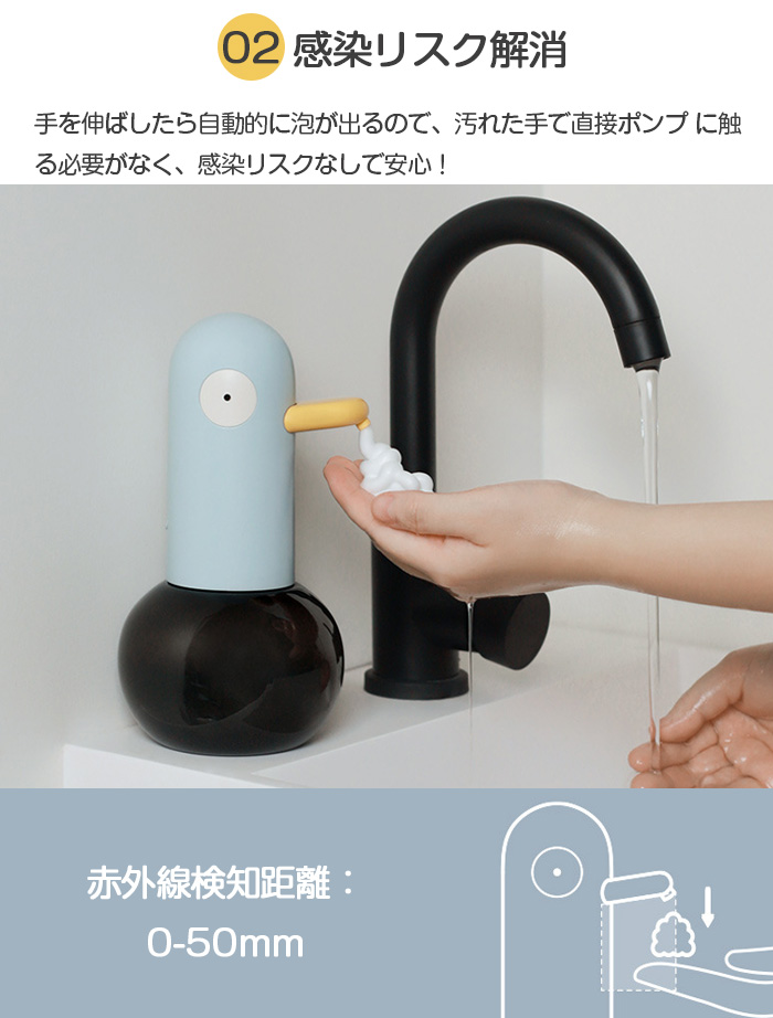 手を伸ばしたら自動的に泡が出るので、汚れた手で直接ポンプ に触る必要がなく、感染リスクなしで安心!