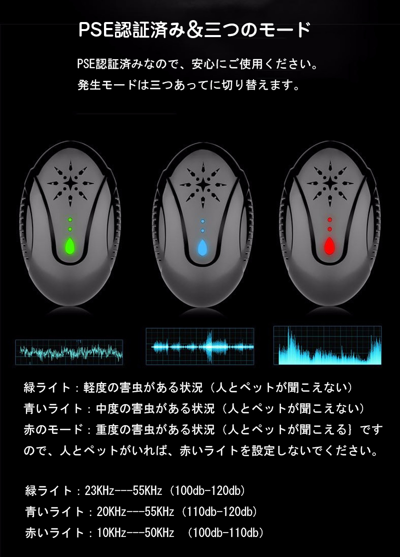 ◆【PSE認証済み+三つのモード】PSE認証済みなので、安心にご使用ください。本装置の発生モードは三つあってに切り替えます。緑ライト:軽度の害虫がある状況(人とペットが聞こえない)青いライト:中度の害虫がある状況(人とペットが聞こえない)赤のモード:重度の害虫がある状況(人とペットが聞こえる}ですので、人とペットがいれば、赤いライトを設定しないでください。