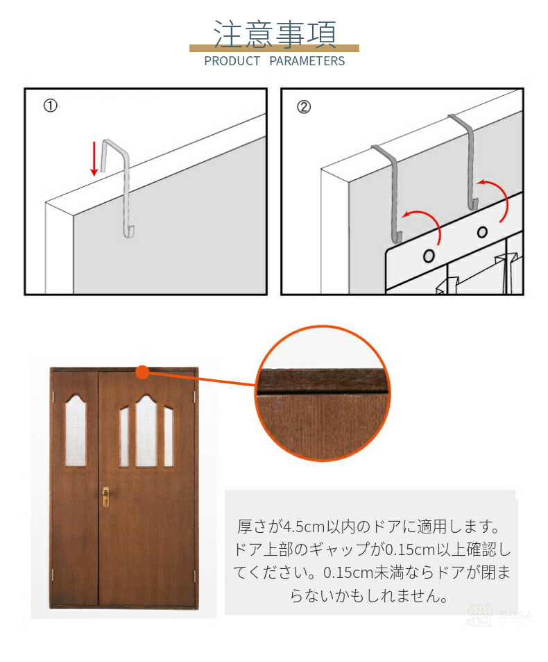 ※厚さが4.5cm以内のドアに適用します。ドア上部のギャップが0.15cm以上確認してください。0.15cm未満ならドアが閉まらないかもしれません。