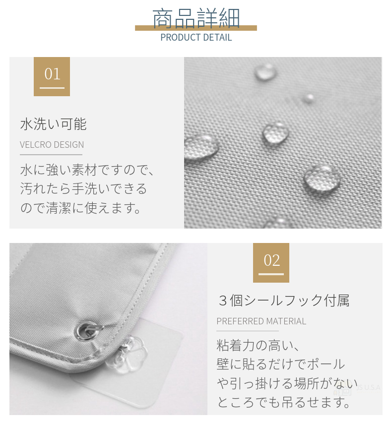 粘着力の高い付属のシールフックが3個付属していますので、 何も工事をしなくて、壁に貼るだけでポールや引っ掛ける場所がないところでも吊るせます。