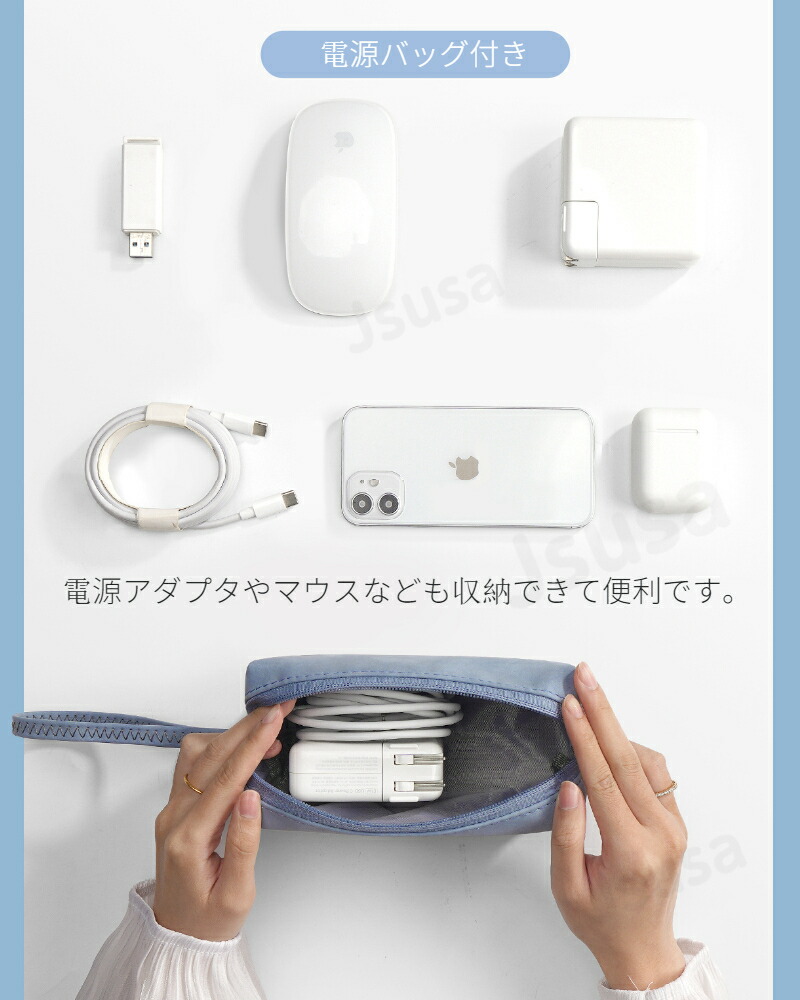 電源バックも付きで、アダプター、充電器、マウス、イヤホンなどの小物を収納できる収納ポーチ付き。外出時に便利です。