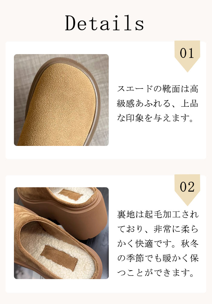 検索関連キーワード(商品の説明ではありません):ムートンシューズ サボサンダル レディース 厚底スリッポン ムートン風サンダル 裏ボア クロッグサンダル 6.5cmヒール スエード かかとなし 美脚 身長アップ 保温 歩きやすい 外履き 靴 滑り止め おしゃれ 履きやすい 痛くない 柔らかい 秋冬 ブラウン コーヒー色 カジュアル 女性 大人 高級感 可愛い ファッション