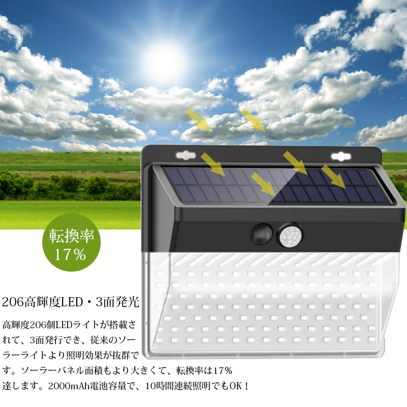高輝度206個LEDライトが搭載されて、3面発光でき、従来のソーラーライトより照明効果が抜群です。ソーラーバネル面積もより大きくて、転換率は17%達します。2000mAh電池容量で、10時間連続照明でもOK!