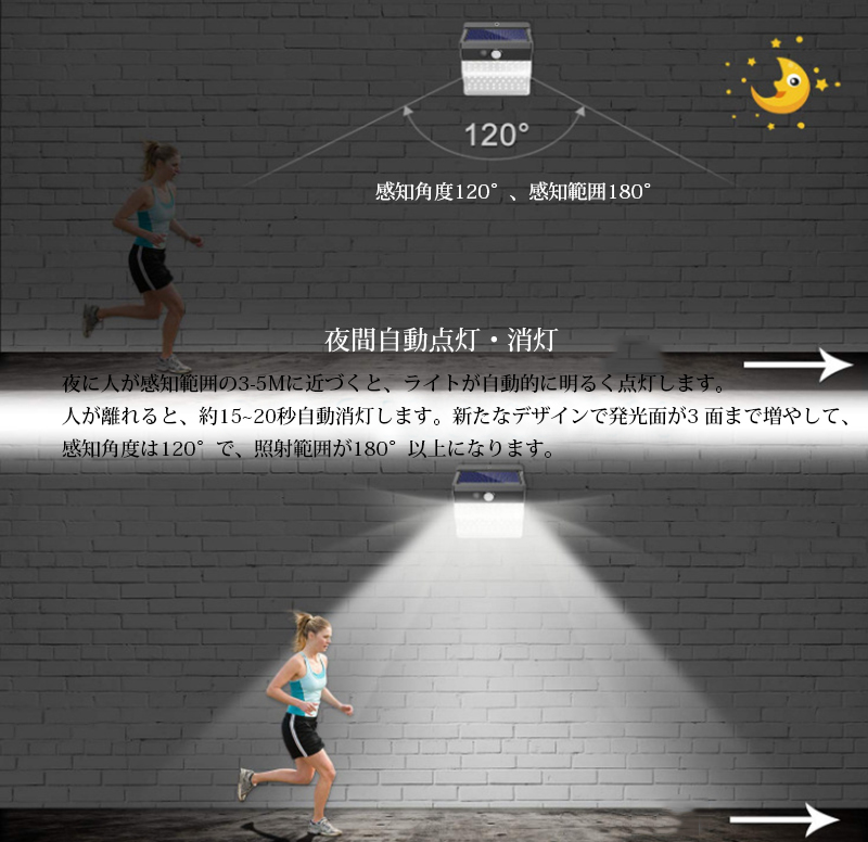 人が離れると、約15~20秒自動消灯します。新たなデザインで発光面が3 面まで増やして、照射範囲が180°以上になります。