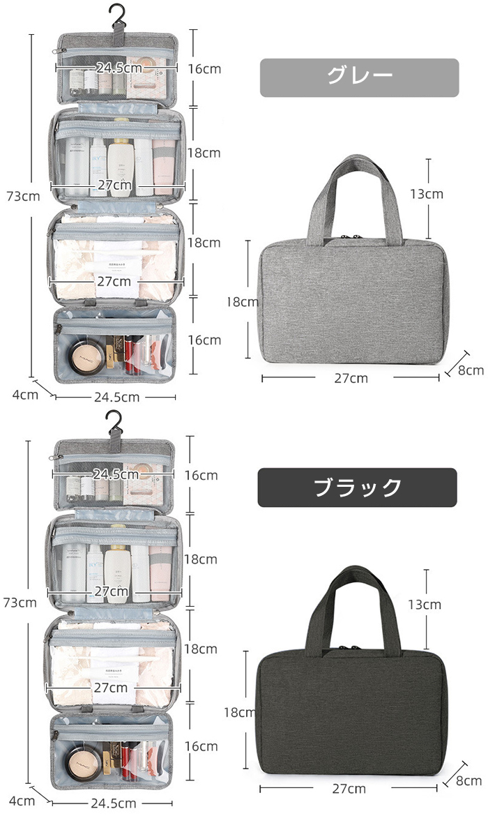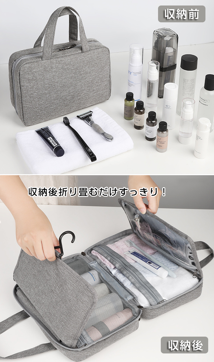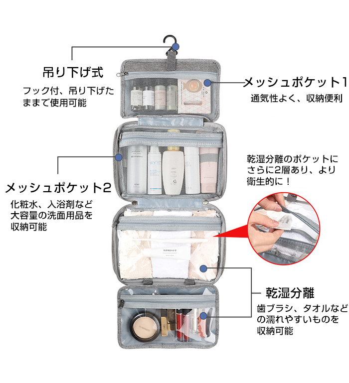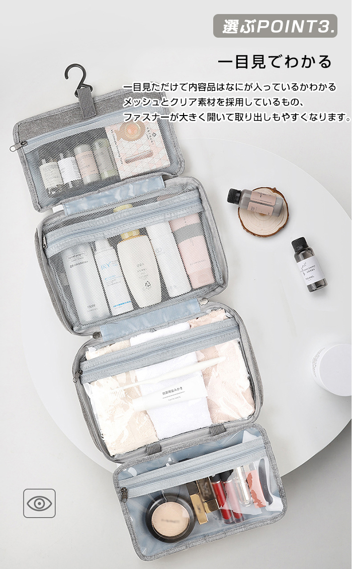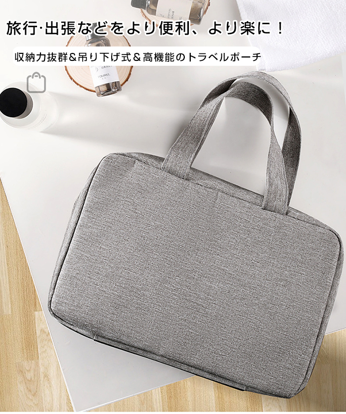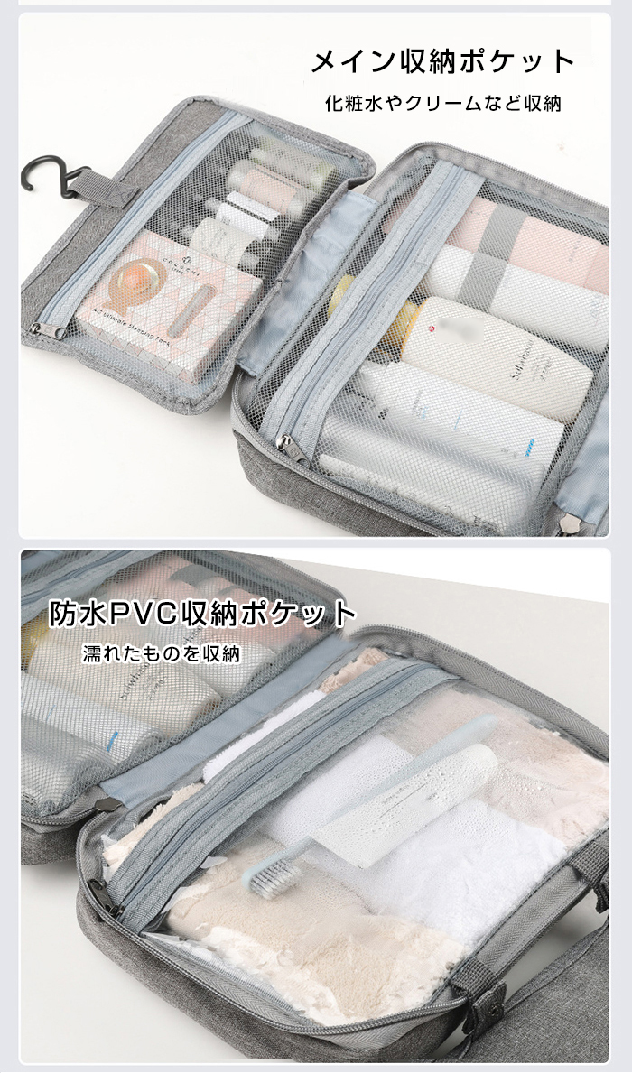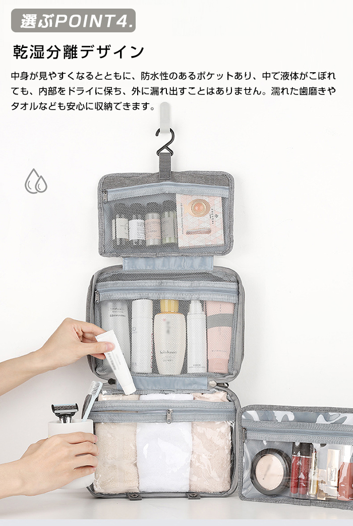 旅行、出張などをより便利、より楽の吊り下げトラベルポーチです 乾湿分離デザイン、一目見ただけで内容品はなにが入っているかわかる