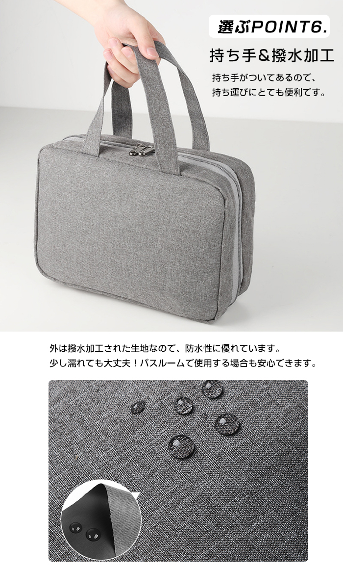 中身が見やすくなるとともに、防水性のあるポケット付き、中で液体がこぼれ ても、内部をドライに保ち、外に漏れ出すことはありません。濡れた歯磨き やタオルなども安心に収納できます。