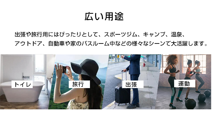 出張や旅行用にはぴったりとして、スポーツジム、キャンプ、温泉、 アウトドア、自動車や家のバスルーム中などの様々なシーンで大活躍します。