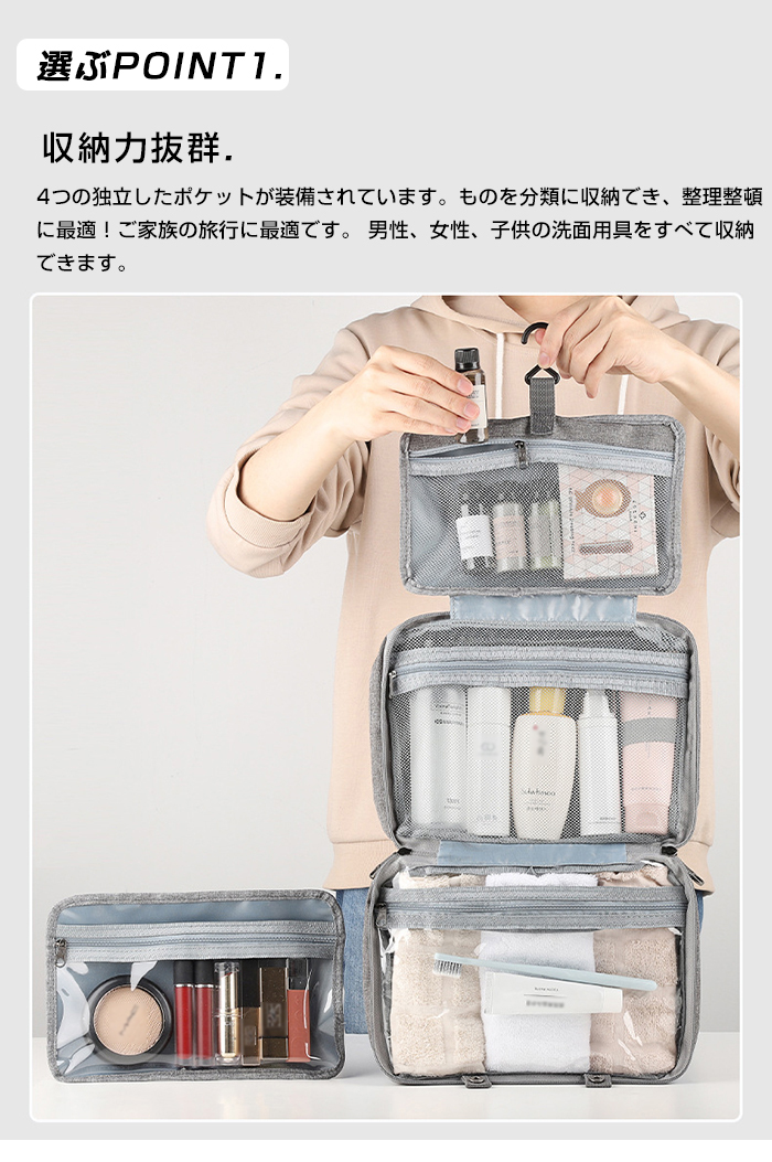 4つの独立したポケットが装備されています。ものを分類に収納でき、整理整頓 に最適!ご家族の旅行に最適です。 男性、女性、子供の洗面用具をすべて収納 できます。