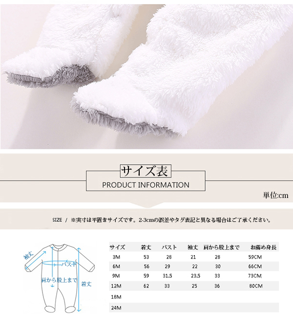 サイズ: 3M(お薦め身長59cm) 6M(お薦め身長66cm) 9M(お薦め身長73cm) 12M(お薦め身長80cm)