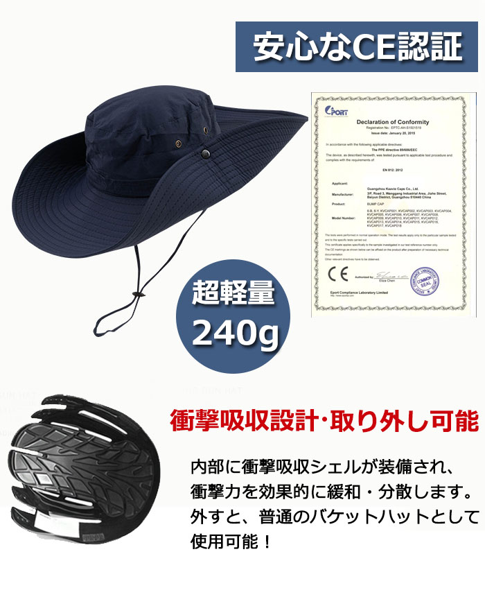内部に衝撃吸収シェルが装備され、衝撃力を効果的に緩和・分散します。 外すと、普通のバケットハットとして使用可能!