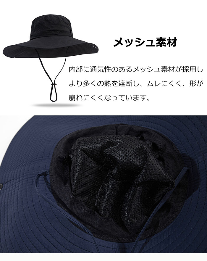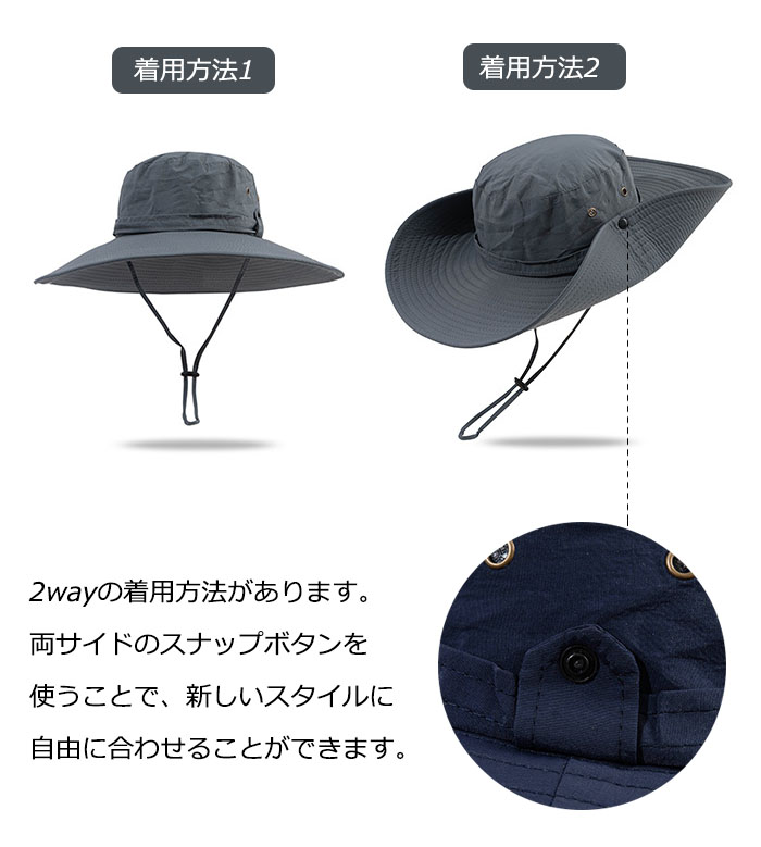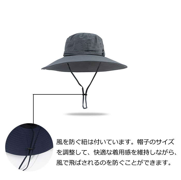 風を防ぐ紐は付いています。帽子のサイズ を調整して、快適な着用感を維持しながら、 風で飛ばされるのを防ぐことができます。