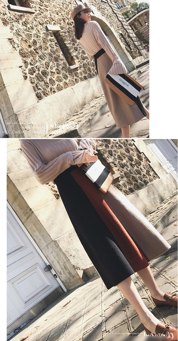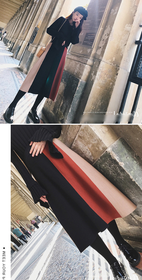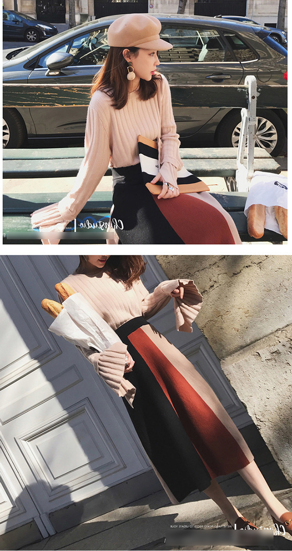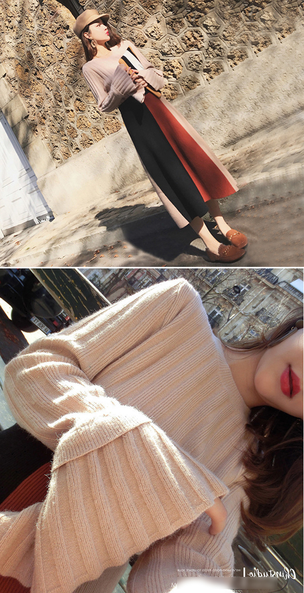 フレア袖のニットセーターと切り替え風ロ