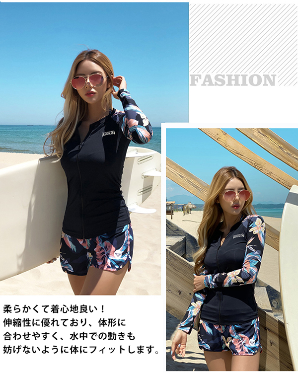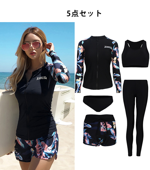 フィットネス 水着 レディース 体型カバー 水着 レディース ラッシュガード 5点セット 長袖 前開き 上下セット セパレート 水着 露出控えめ UVカット タンキニ ショートパンツ レギンス 女子